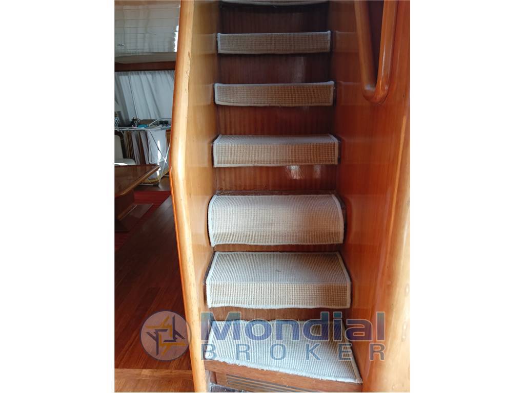 Cabina armatoriale, cabina matrimoniale, 2 cabine ospiti doppie in piano, 4 toilettes, cucina, dinette, salone, cabina marinaio con toilette. Calpestio in legno.