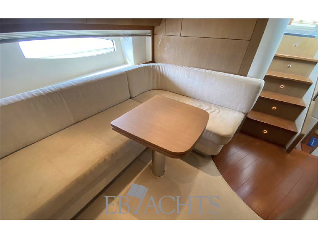 Gli spazi esterni sono progettati per il massimo relax e convivialità: ampi prendisole a prua e a poppa invitano a godersi il sole, mentre il pozzetto accoglie con comodi divani e un tavolo estendibile, perfetto per pranzi e momenti di socialità. La plancia di comando è affiancata da un divano per il co-pilota, creando uno spazio funzionale e accogliente.
