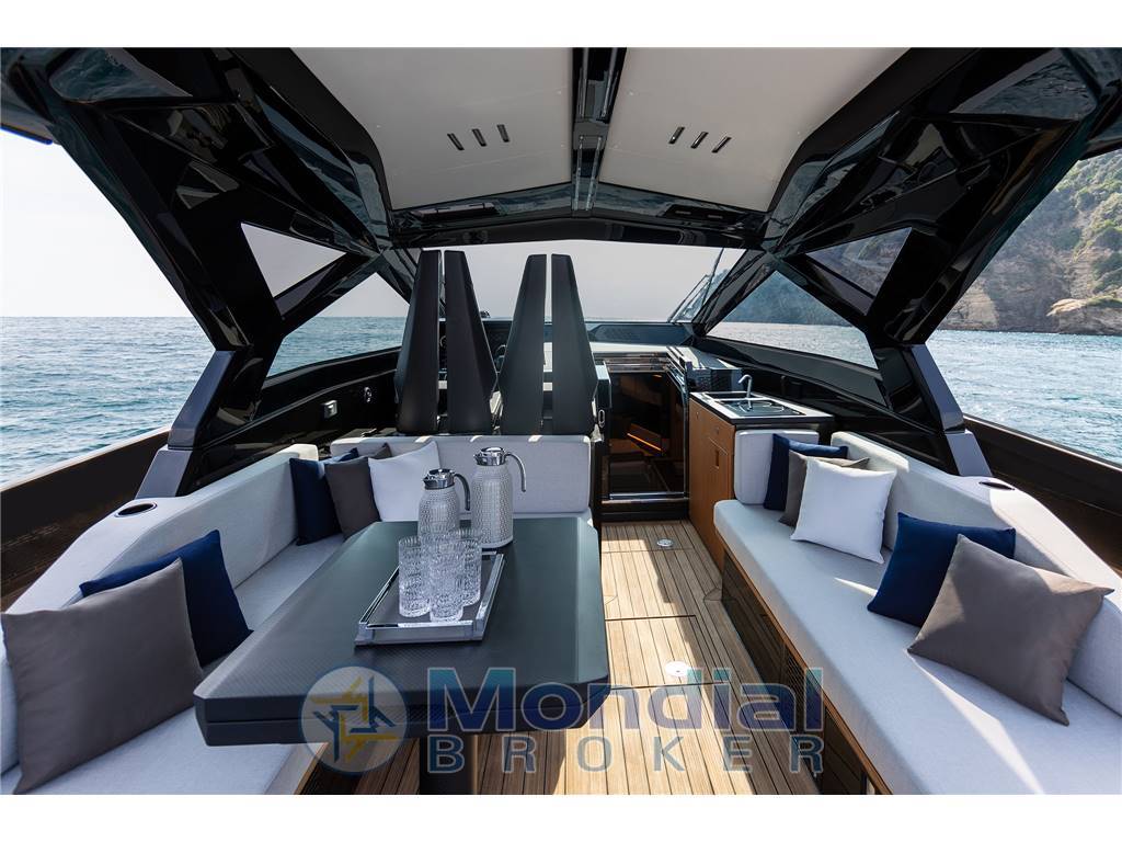Gli spazi esterni sono concepiti come un vero open living sul mare: ampie aree prendisole a prua e a poppa, terrazze laterali abbattibili, tavolo centrale in carbonio e un pozzetto elegante e funzionale, ideale per la vita diurna e l’intrattenimento.