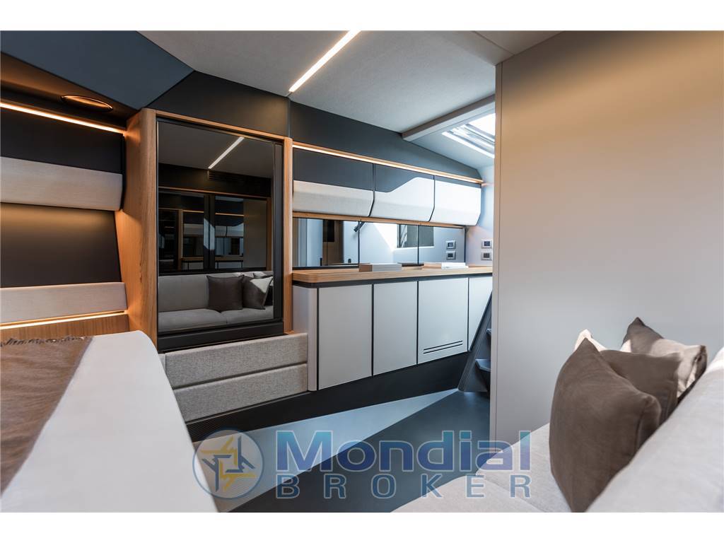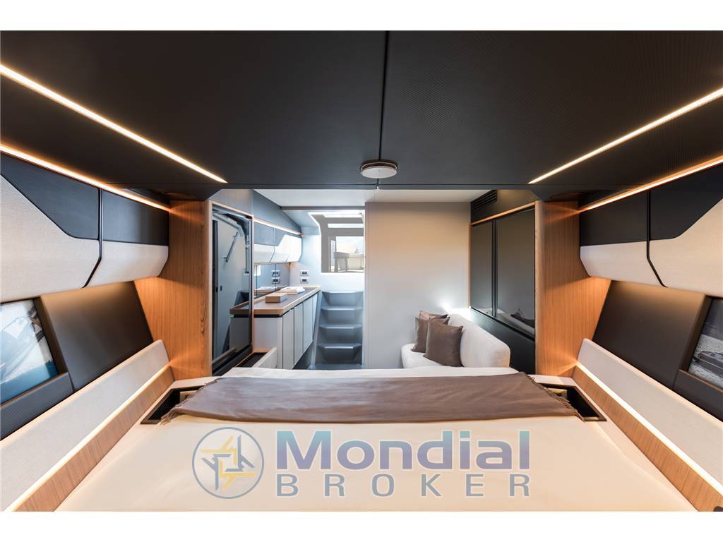 Sottocoperta, l’ambiente è minimalista e raffinato, con una cabina matrimoniale accogliente, bagno separato e soluzioni intelligenti per lo stivaggio. L’utilizzo di materiali pregiati, carbonio a vista e legni selezionati crea una continuità stilistica con l’esterno, mantenendo intatto l’inconfondibile DNA Wally.