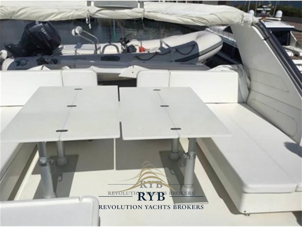 Allarme motore, Allarme sentina, Ancora, Camminamenti laterali in teak, Doccia esterna, Doppia timoneria, Elica di poppa - stern thruster, Elica di prua - bow thruster, Faro orientabile, Flap idraulici, Gruette per tender su fly, Impianto antincendio, Luci di cortesia, Passerella (IDRAULICA A SCOMPARSA), Piattaforma (TEAK), Pompa di sentina automatica, Pompa di sentina elettrica, Porta ingresso, Porta laterale, Pozzetto Teak, Presa 220V banchina, Presa acqua banchina, Salpa Ancore Elettrico, Scaletta da bagno, Tavolo pozzetto, Tromba, 2 Winch tonneggio di poppa, Winch tonneggio di prua.