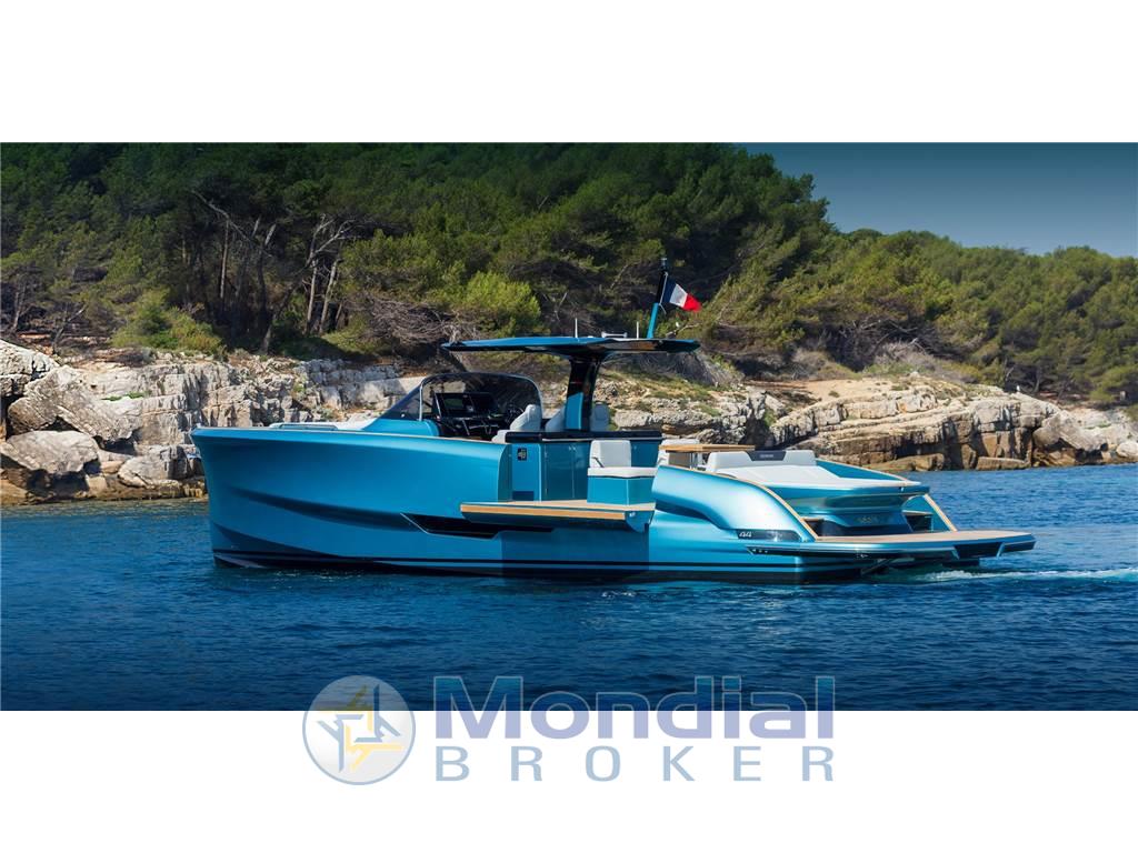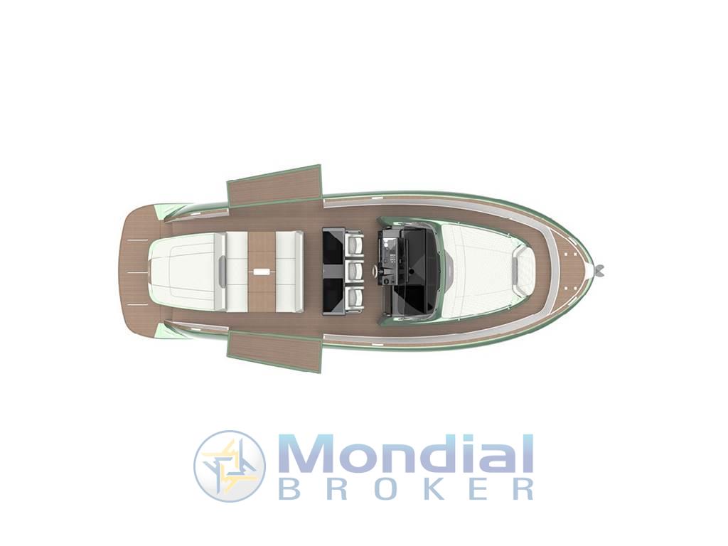Versione con terrazze apribili, plancetta di poppa allungata con passerella con funzione scaletta bagno, T-Top in carbonio maggiorato con tendalino elettrico incorporato.