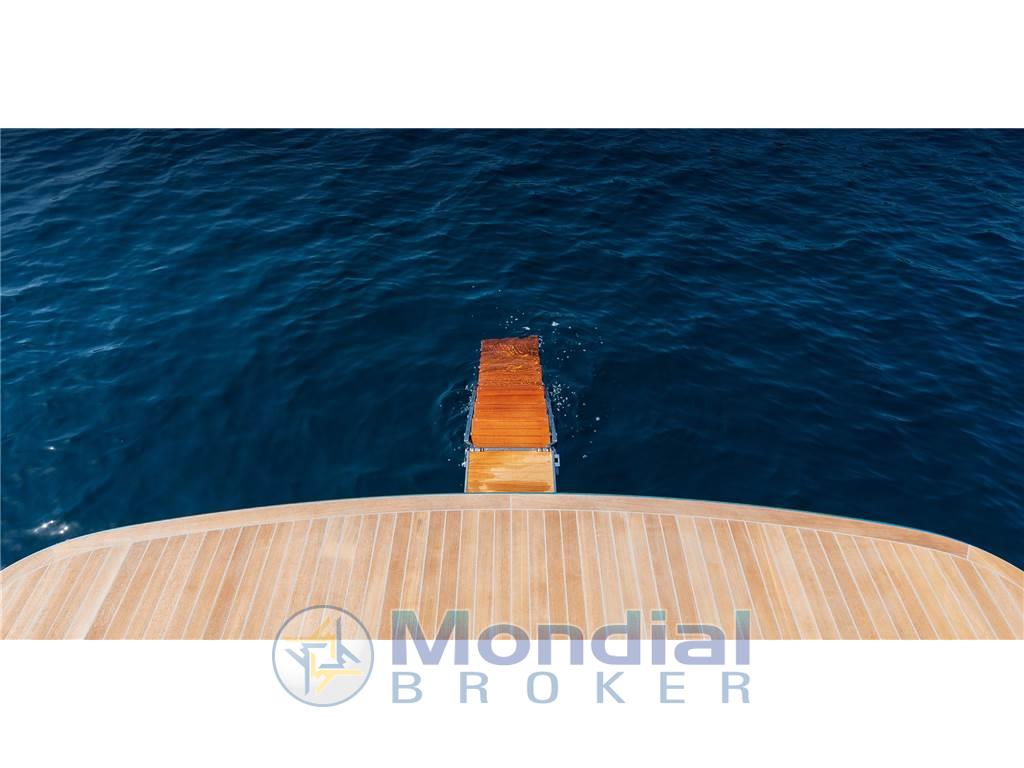 Ancora, 8 Bitte Abbattibili, Camminamenti laterali in teak, Cavo corrente di banchina, Doccia esterna, Flap elettrici, Hard top, Impianto antincendio, Lavandino nel Pozzetto, Parabordi, Passerella, Pompa di Scarico del Serbatoio Acque Reflue, Pompa di sentina automatica, Ponte in teak, Pozzetto Teak, Presa 220V banchina, Salpa Ancore Elettrico, Scaletta da bagno, Tavolo pozzetto, Tromba, T-Top, Tuga in teak.