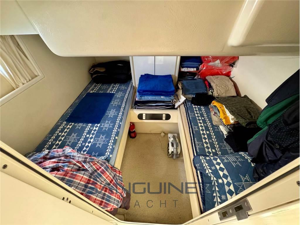 A prua si trova la cabina armatoriale matrimoniale, luminosa e con armadiature. A centro barca, la cabina ospiti dispone di due letti in piano. La dinette, accogliente e rifinita in legni chiari, è trasformabile per offrire ulteriori posti letto. La cucina è attrezzata con piano cottura, frigorifero e spazi contenitivi, mentre il bagno è separato e dotato di wc, lavabo e doccia