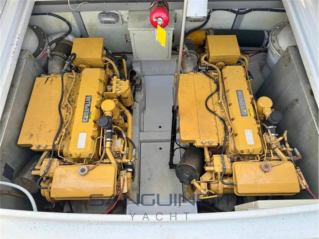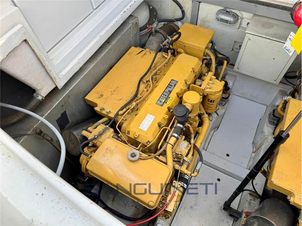 motorizzazione Caterpillar in linea d’asse, passerella idraulica, verricello elettrico di prua con catena e ancora, tendalini per pozzetto e prendisole, ampie aree esterne vivibili con dinette trasformabile e grande prendisole a prua. Plancetta bagno con scaletta, doccia esterna e numerosi gavoni per lo stivaggio