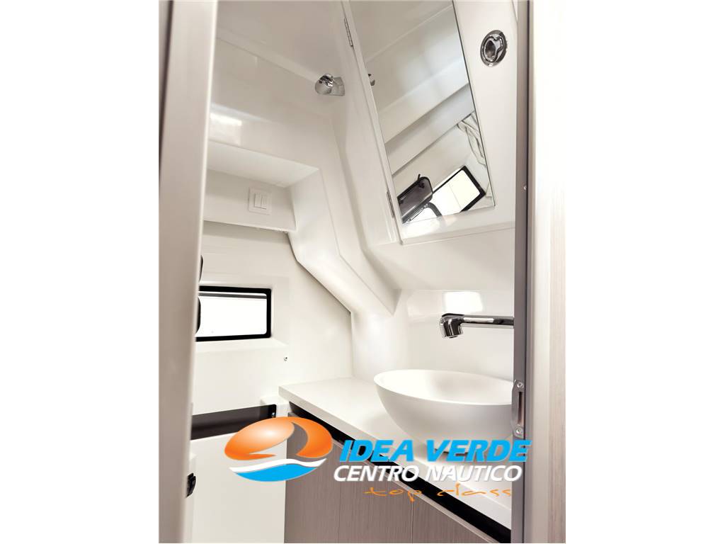 Gli interni della Merry Fisher 895 sono progettati per offrire comfort e vivibilità di alto livello anche in uno spazio compatto. Sottocoperta troviamo due cabine separate, con cabina armatoriale a prua illuminata da grandi finestrature e una seconda cabina laterale, entrambe dotate di cuccette comode e spazio di stivaggio dedicato; la dinette interna può essere facilmente convertita in un ulteriore letto, consentendo di accogliere fino a sei persone per la notte. La cucina è moderna e funzionale, con piani di lavoro, frigorifero e ampi vani, mentre il bagno interno è spazioso e completo di WC marino e doccia. Le ampie superfici vetrate creano un ambiente luminoso, caldo e aperto verso il mare, trasformando gli spazi sottocoperta in un vero ambiente conviviale e protettivo in ogni condizione meteo.