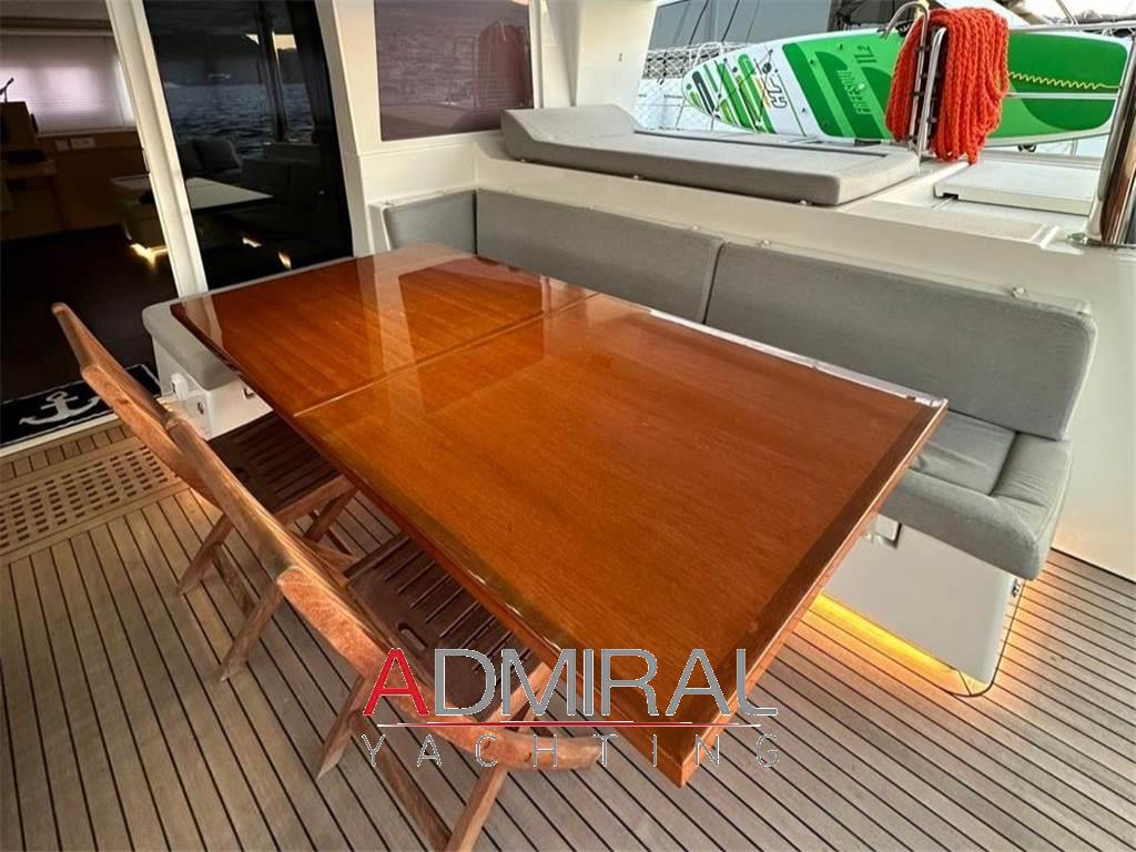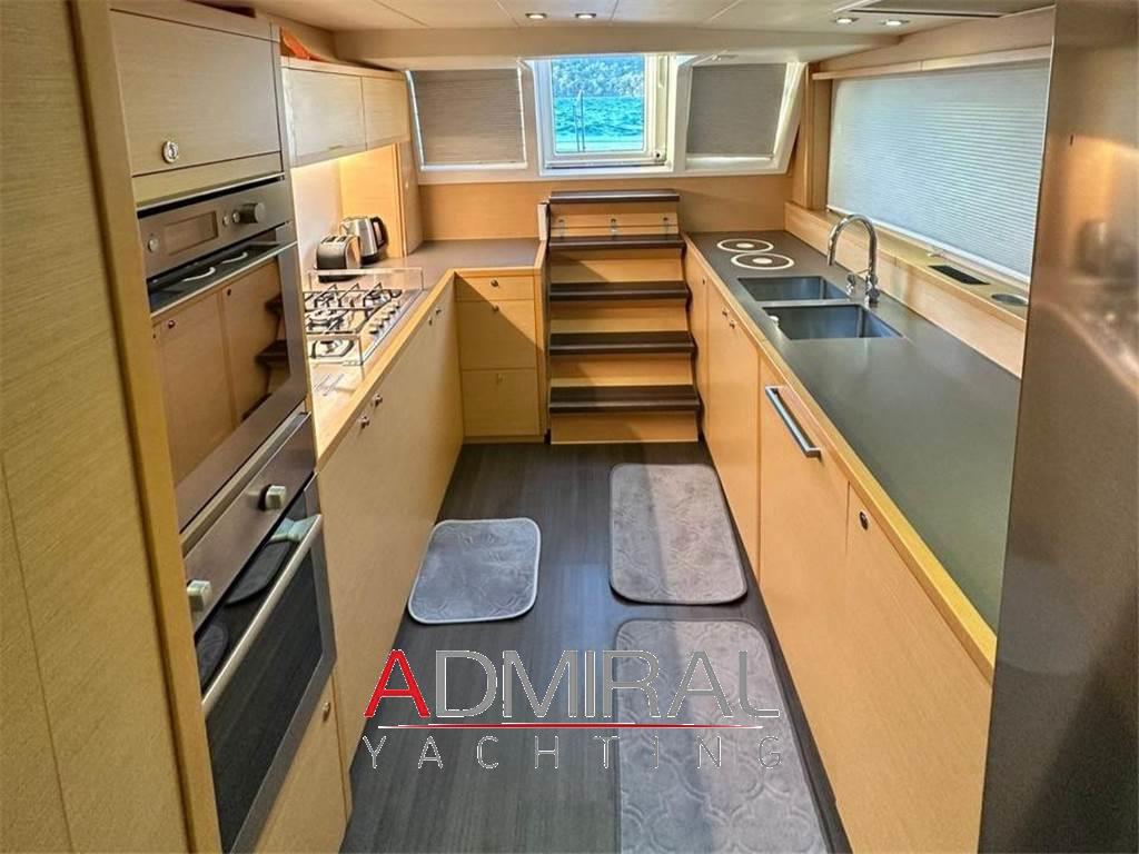 La cucina è posizionata nello scafo di babordo, separata dalla zona living principale, con doppio accesso, dal salone e dal pozzetto, ed è dotata di doppio lavabo, piano cottura a 5 fuochi a gas, e di elettrodomestici moderni tra cui forno, microonde, frigo e congelatore a colonna e lavastoviglie