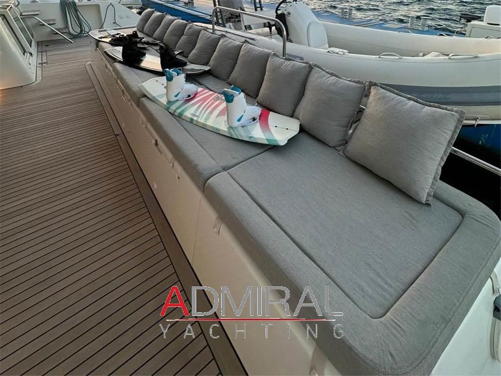 Il ponte principale si estende sul pozzetto di poppa, concepito come una terrazza sul mare, mentre il flybridge, accessibile tramite scalinata, offre una seconda zona di controllo e relax con sedute e ampi prendisole