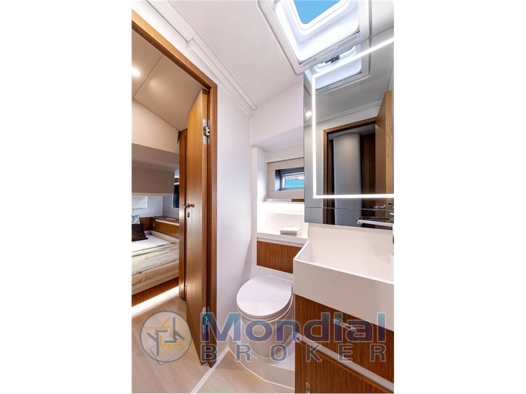 Cabina ospiti matrimoniale a sinistra con bagno e doccia separata; Cabina ospiti a dritta matrimoniale con bagno e doccia separata; Armatoriale a prua con letto a isola, bagno e doccia separata. Wc elettrici.