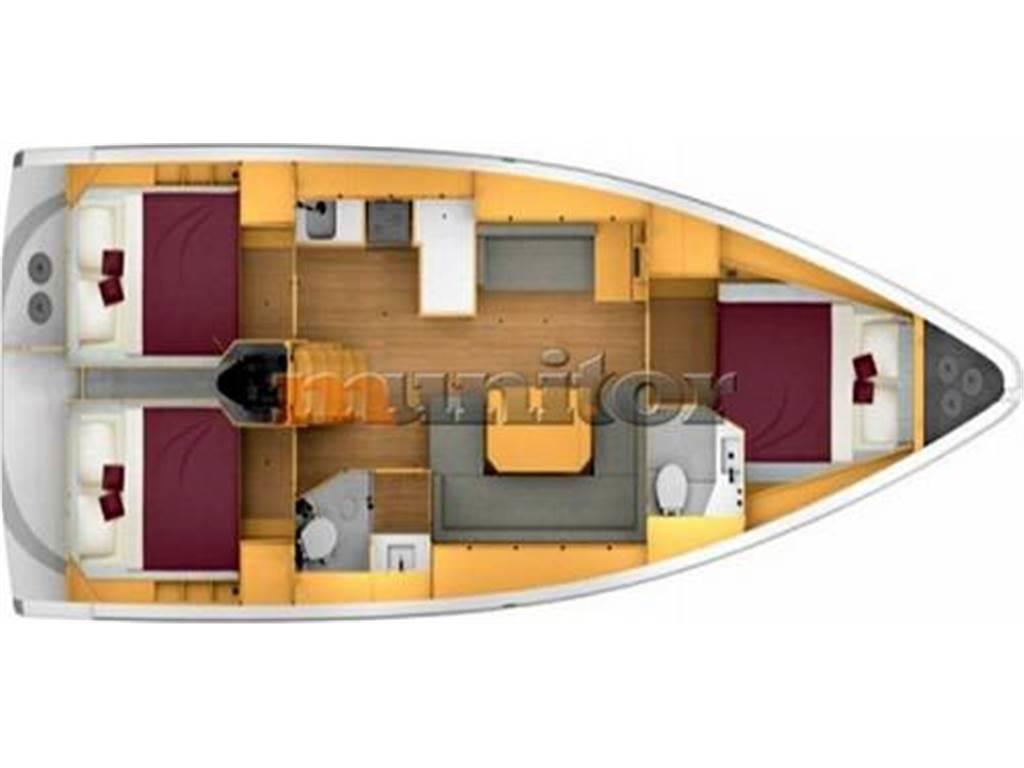 Salone, cucina, cabina di prua, 2 cabine di poppa, 2 bagni, 2 WC, pozzetto