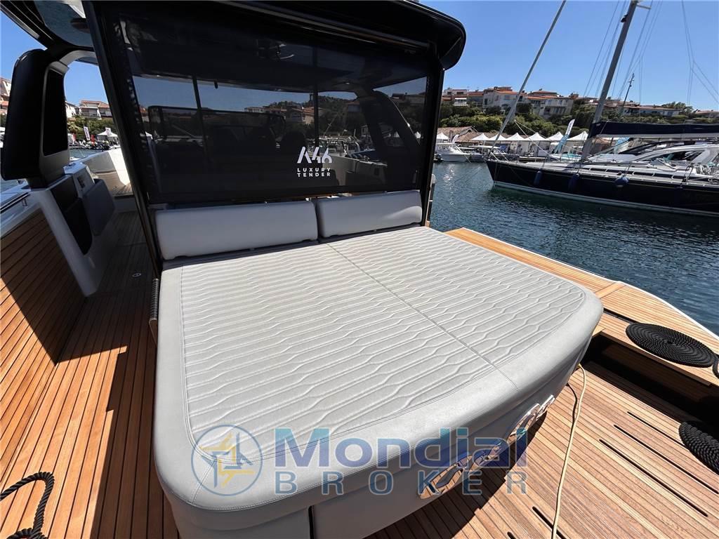 Aria condizionata (16.000BTU cabine con pompa di calore), Bimini (Bimini top a prua, microforato nero con pali in carbonio.), Cuscineria completa, Cuscineria di poppa, Cuscineria di prua, Cuscineria Pozzetto, Frigorifero esterno, Frigorifero interno, ICE Maker, Meccanismo saliscendi per TV, Oscuranti (poppa pozzetto, microforato nero, scirtta "A46 Luxury Tender" colore bianco), Piastra elettrica (GRILL elettrico mobile pozzetto), Stereo, Teli chiusura T-Top, Telo copriconsolle, Telo coprisedile, Tenda Elettrica, TV (TV LED salone 32" con meccanismo manuale a scomparsa. Incluso inverter)