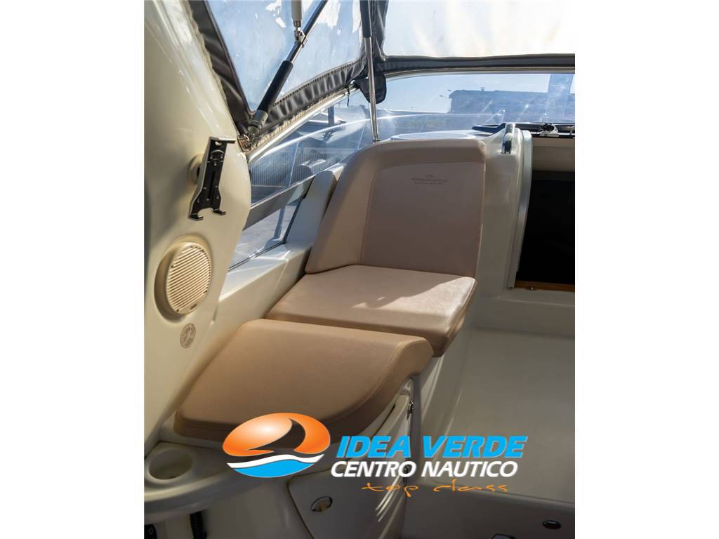 The Cranchi Zaffiro 29 is equipped with a complete equipment that guarantees comfort, safety and ease of navigation. There are camper closures for protection and privacy, electric flaps for stability while sailing, an electric winch to facilitate anchoring operations, and a walkway for boarding and disembarking. The 220V socket, 4-car stereo system, electric horn, compass, TV system, Raymarine A65 navigation system and all the tools necessary for optimal management of the vessel complete the setup.