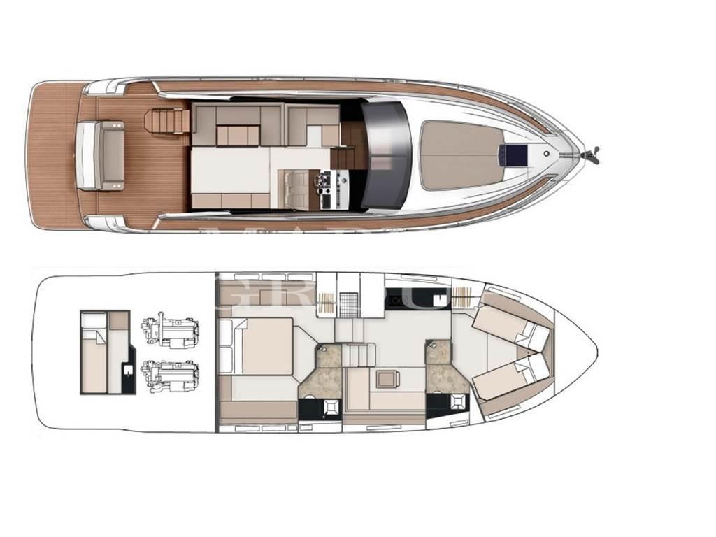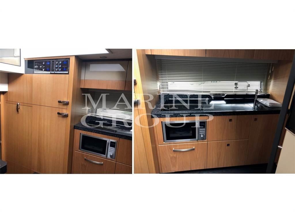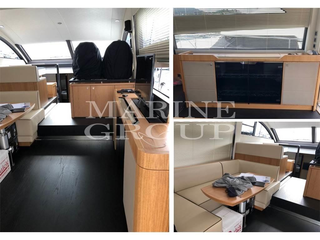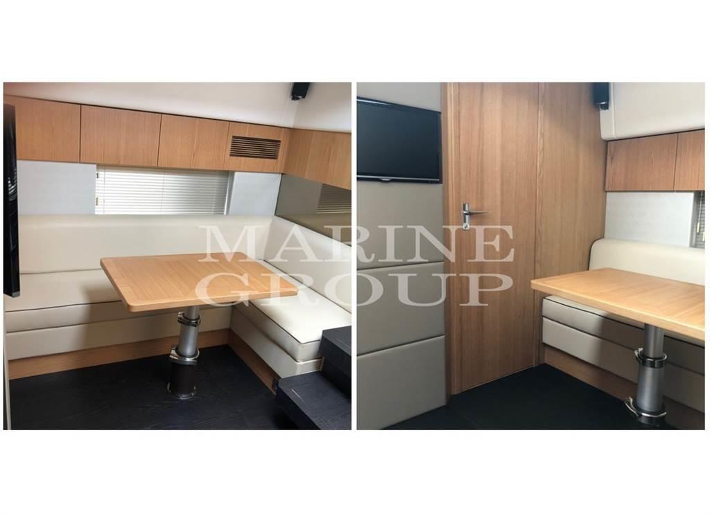 Salone con grandi finestrature e bellissimi interni - Upgrade pavimentazione in wenge con arredamenti in rovere a contrasto - Upgrade divano in pelle chiara con mobile TV - Upgrade zona a sedere a L in pelle di fianco alla postazione di guida - Nel lower deck cucina attrezzata e upgrade dinette in pelle chiara e TV - Ampia cabina armatoriale a centro barca con bagno privato e box doccia separato – Cabina di prua VIP con letto matrimoniale trasformabile in due letti singoli e bagno con box doccia separato - Cabina marinaio comprensiva di letto, wc, lavandino, acque nere e aria condizionata