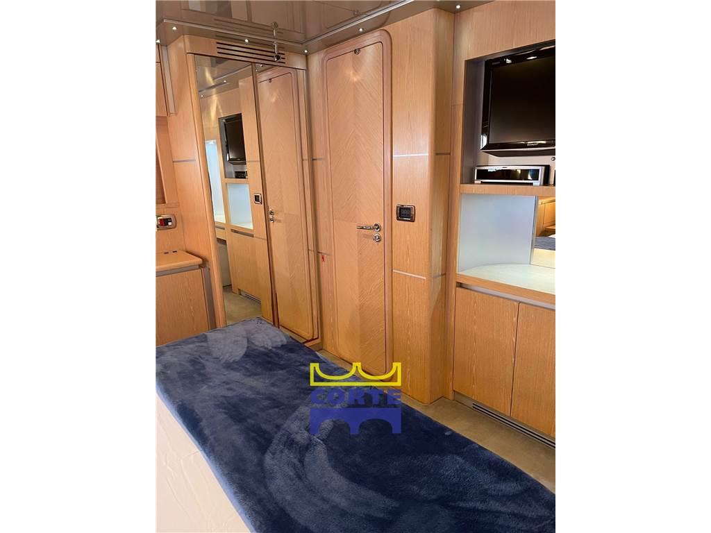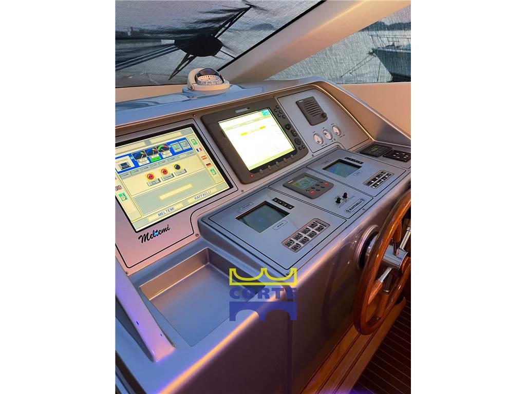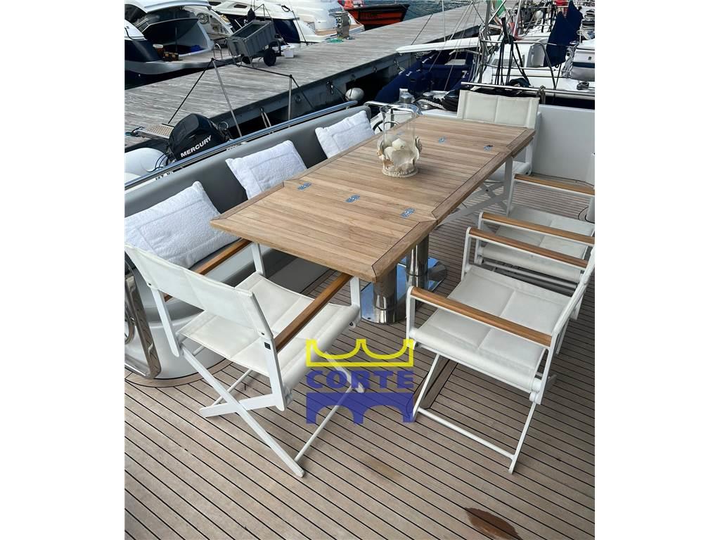 Allarme motore, Allarme sentina, Ancora, Angolo barra, Antenna radar, Autoclave, Batterie, Bussola, Caricabatterie, Comando motori elettronico, Computer di bordo, Contametri catena, Contamiglia, 2 Display (motori Caterpillar), Doccia esterna, Doppia timoneria, Ecoscandaglio, Elica di poppa - stern thruster (Vetus), Elica di prua - bow thruster (Vetus), Faro orientabile, Flap elettrici, Gruette per tender (sulla piattaforma di poppa), Luci di cortesia, Luci subacquee, Passerella (elettroidraulica a scomparsa), Piattaforma (poppa in teak), Pilota automatico, Plotter con antenna GPS, Pompa di sentina automatica, Pompa di sentina elettrica, Porta ingresso, Pozzetto Teak, Presa 220V banchina, Presa acqua banchina, Radar, Radio VHF, Salpa Ancore Elettrico (Quick), Scaletta da bagno, Tavolo pozzetto, Tender, Tromba, Winch Elettrico, 2 Winch tonneggio di poppa (Quick), Winch tonneggio di prua (Quick)