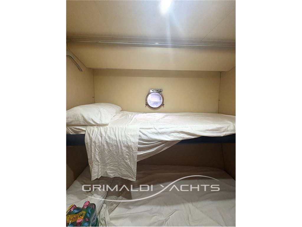 Ampio e luminoso layout interno: dispone di due cabine matrimoniali italiane, perfettamente rifinite, una cabina doppia con letti a castello per gli ospiti e una cabina equipaggio con wc separato.