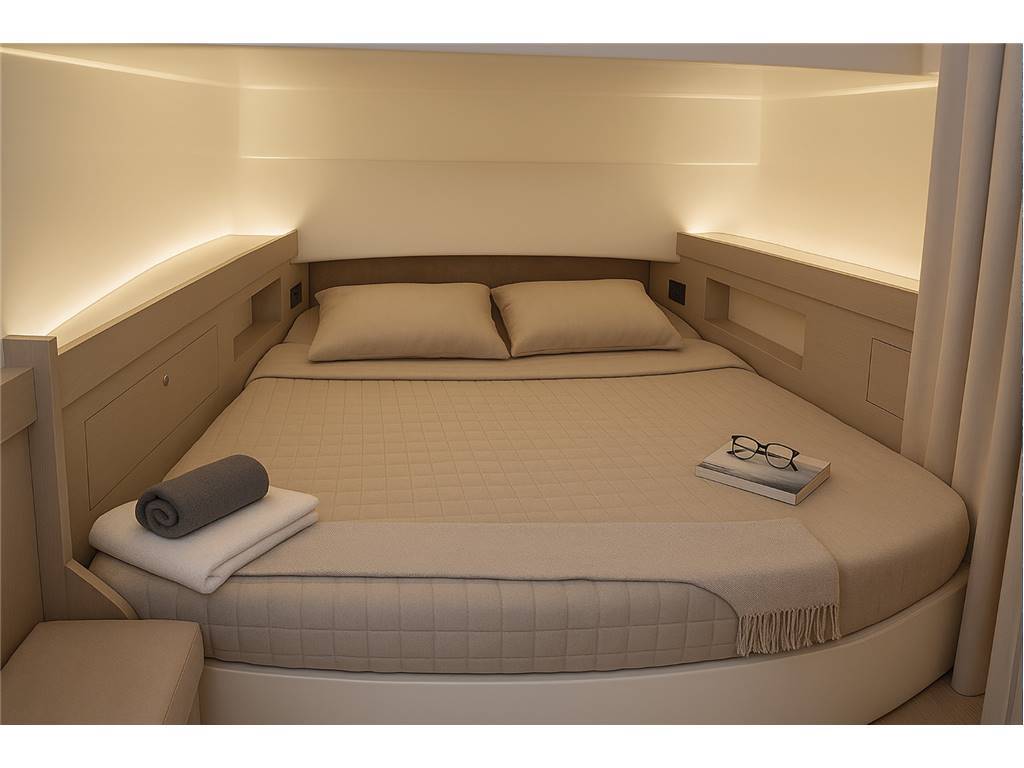 La cabina è un open space con letto king size. Per l’arredo sono stati utilizzati materiali di pregio rigorosamente Made in Italy, scelta che contraddistingue il dna del cantiere. Anche in questo caso sono ampie le possibilità di personalizzazione.