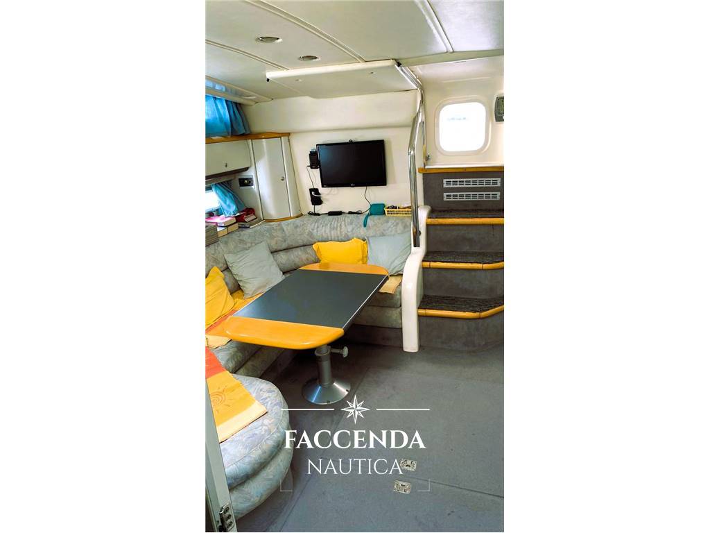 1 Doppia in piano + 1 letto singolo in cabina di poppa con lavandino, 1 Matrimoniale italiana in cabina di prua, 1 Toilette con cabina doccia separata. Interni con spazi ampi e ben vivibili, cucina comoda e accessoriata, l'imbarcazione è omologata per dieci persone trasportabili.
