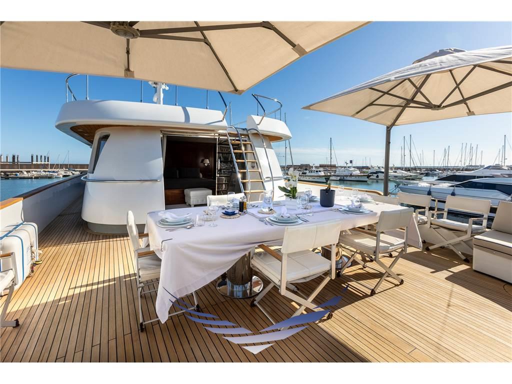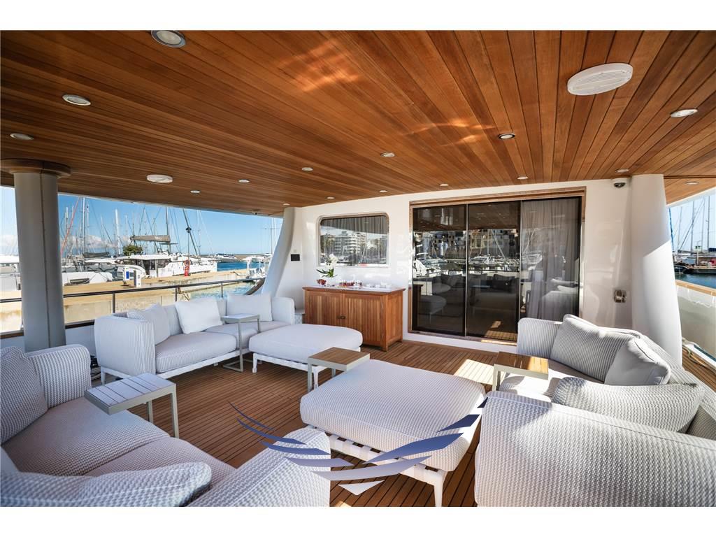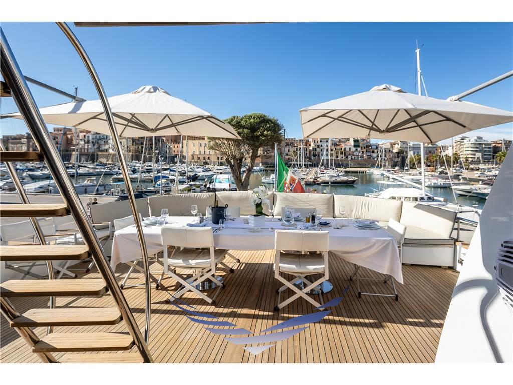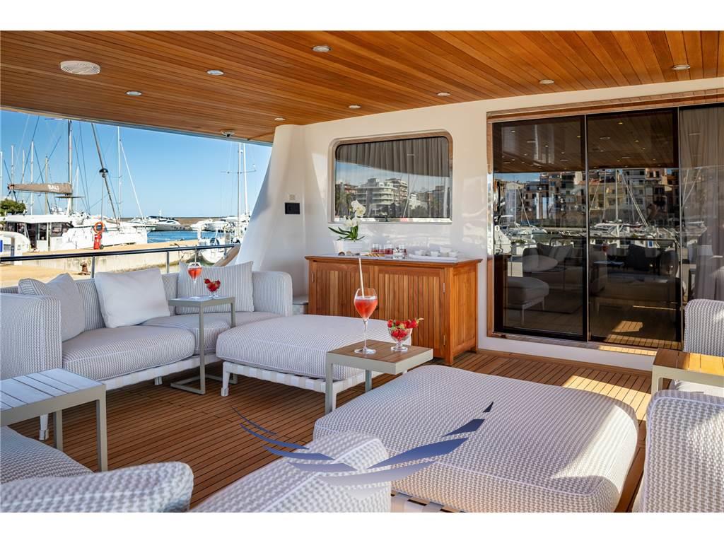 Lo yacht presenta inoltre un suggestivo open space caratterizzato da grandi finestrature che garantiscono una splendida vista panoramica e una straordinaria luminosità naturale negli ambienti interni, creando un’atmosfera accogliente e raffinata.