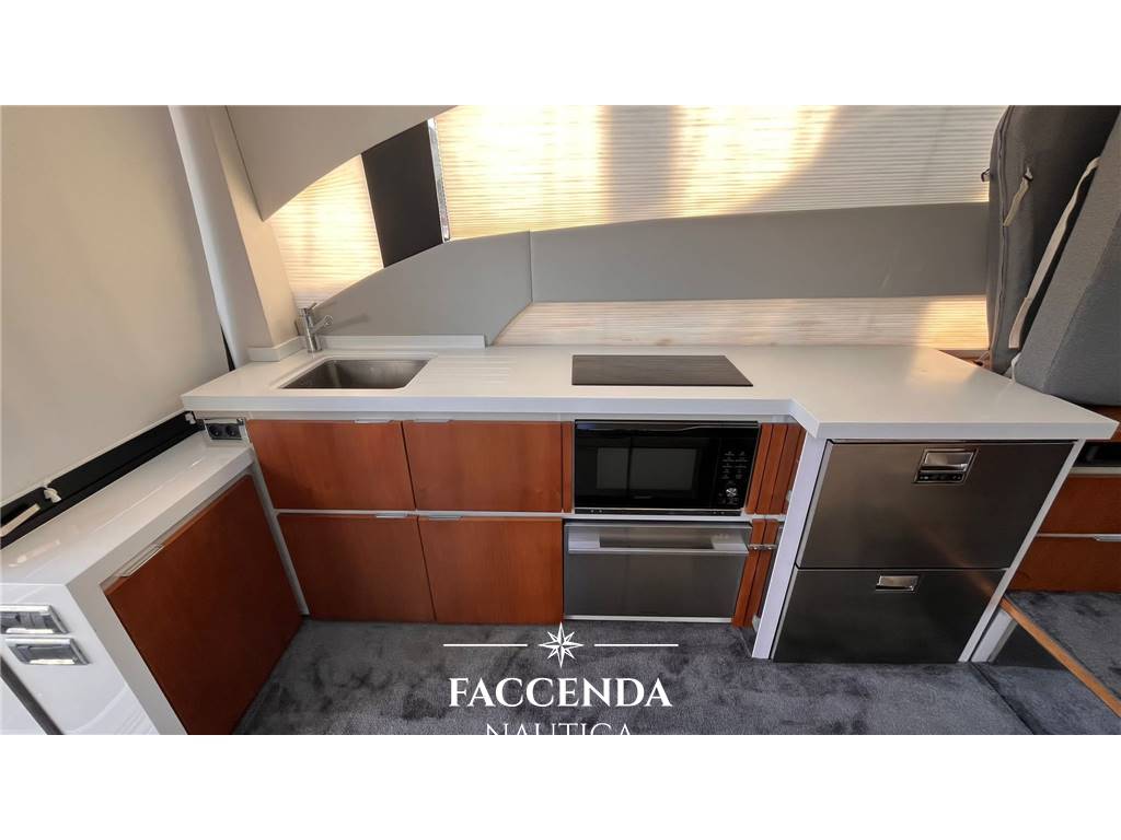 Gli interni spaziosi sono luminosi e moderni, con un hard top scorrevole e ampie vetrate sopra e sotto coperta. Il salone si apre armoniosamente sul ponte di poppa, dove gli ospiti possono cenare all'aperto grazie agli ampi posti a sedere, che si trasformano facilmente in un grande prendisole. Il ponte di prua offre un ulteriore prendisole doppio, mentre la piattaforma da bagno estesa consente un facile accesso all'acqua.