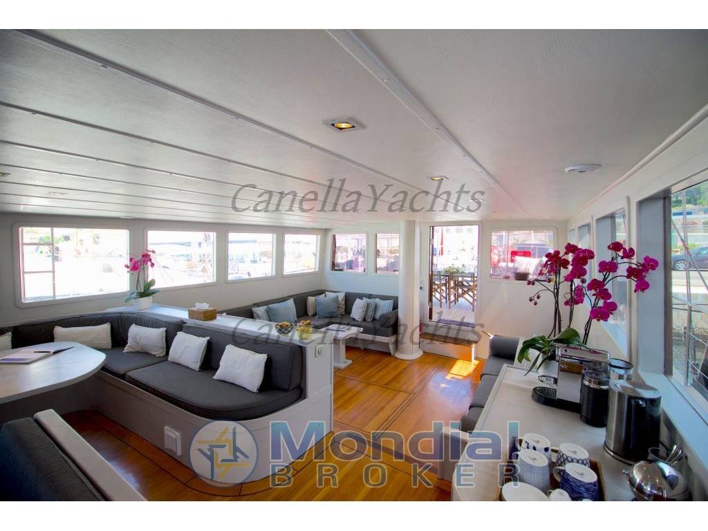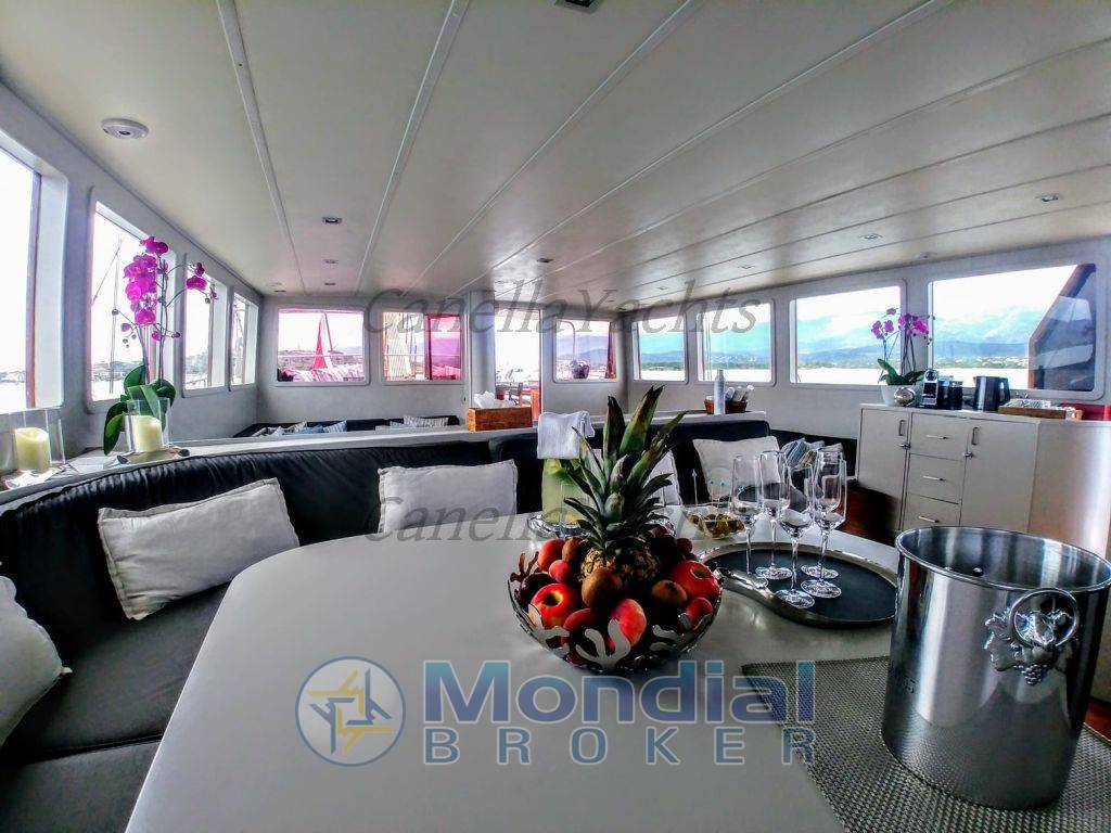 Lo yacht ha un interno contemporaneo con pannelli in legno caldo, tappeti bianchi e invitanti mobili morbidi. Il salone e la sala da pranzo è un open space. Lo spazio lounge si trova a poppa nella cabina rialzata con un divano e sedie occasionali. Una credenza isola crea una separazione casuale dalla zona pranzo formale. Con la tuga rialzata, il salone e la sala da pranzo ricevono ampia luce naturale e offrono una vista ottimale.