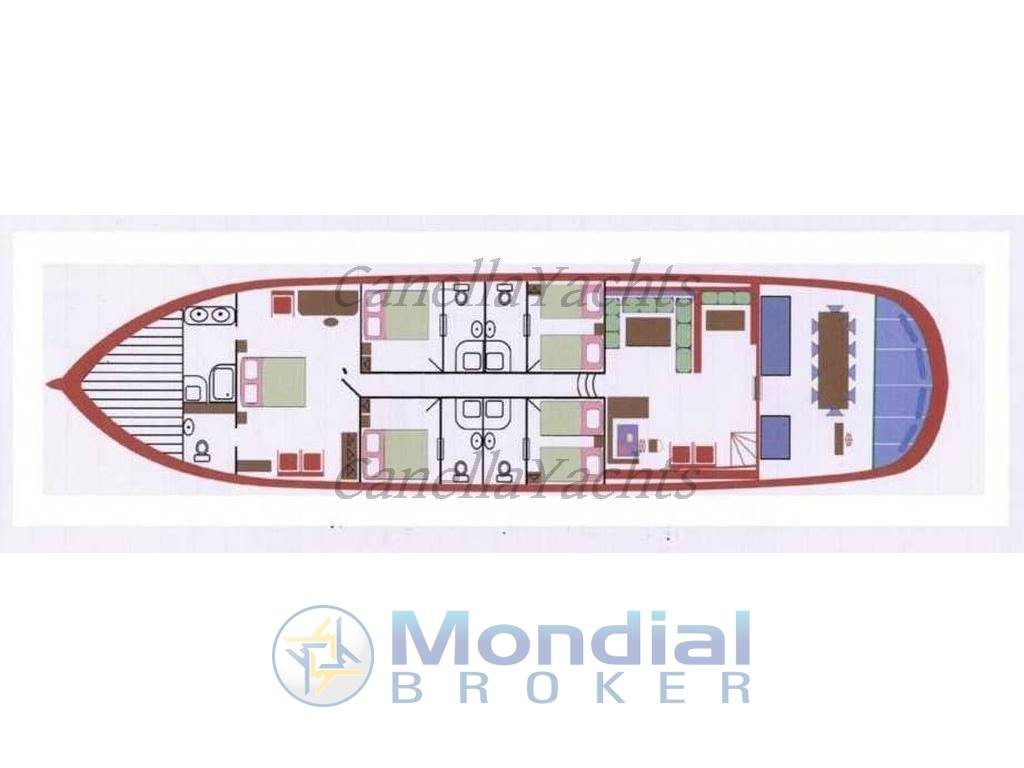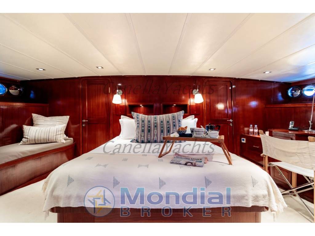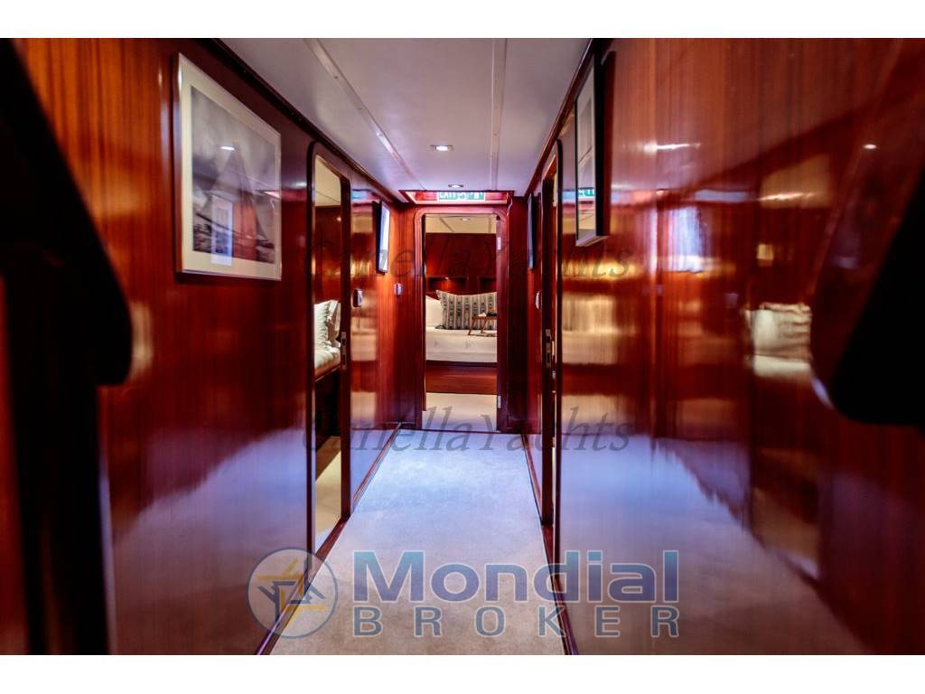 La cabina armatoriale è avanti e pieno raggio dello yacht con un centro rivestito letto matrimoniale, divano, vanità e bagno con vasca. Due cabine doppie sono a babordo e a tribordo a metà nave, seguite da altre 2 cabine a babordo e a tribordo con letti singoli affiancati.Ogni cabina offre aria condizionata, oblò per la ventilazione naturale e luce e intrattenimento TV.