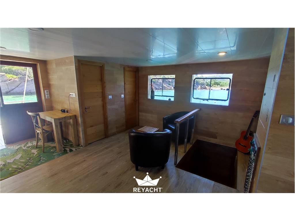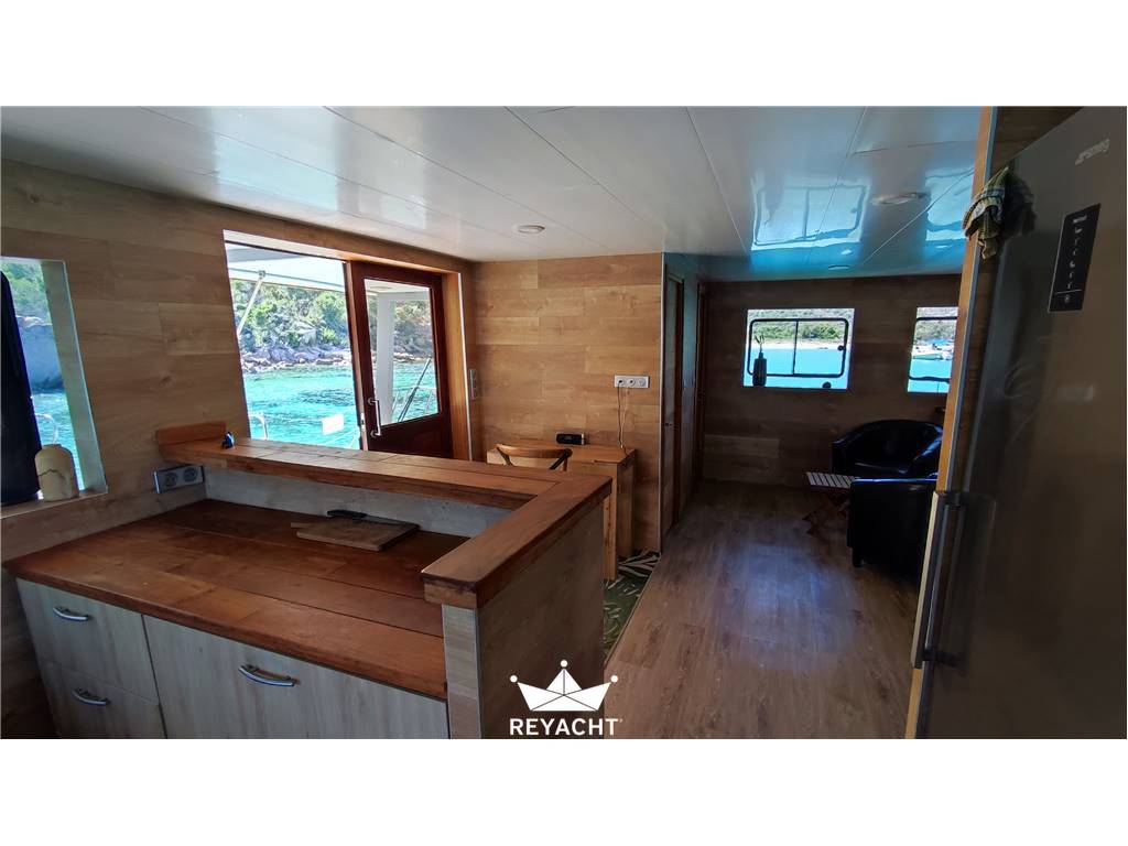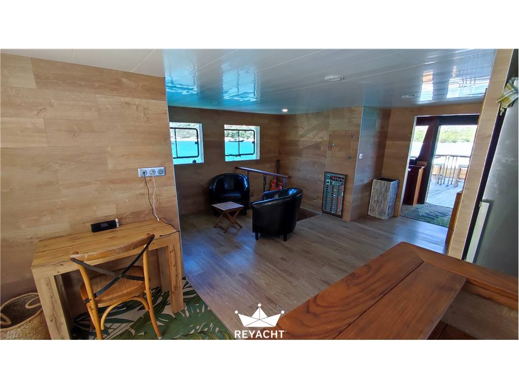 Catamaran en excellent état et aménagé avec matériaux de grandes qualités. Conçu pour recevoir jusqu'à 25 personnes pour déjeuner, événements et apéritifs. Equipé d'une cuisine complète et d'un bar qui donne sur la plage avant. Deux cabines spacieuses et confortables avec leur douche et lavabo. Deux toilettes indépendants sur le main deck. Coque en Acier de 18m large de 8 mt et tirant d'eau de 1,5m. Pont en teck. Deux moteurs Cummins de 170hp. https://www.cummins.com/fr/engines/marine