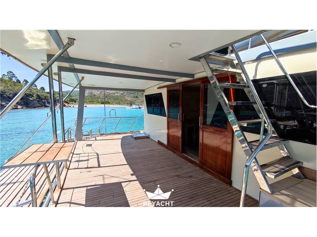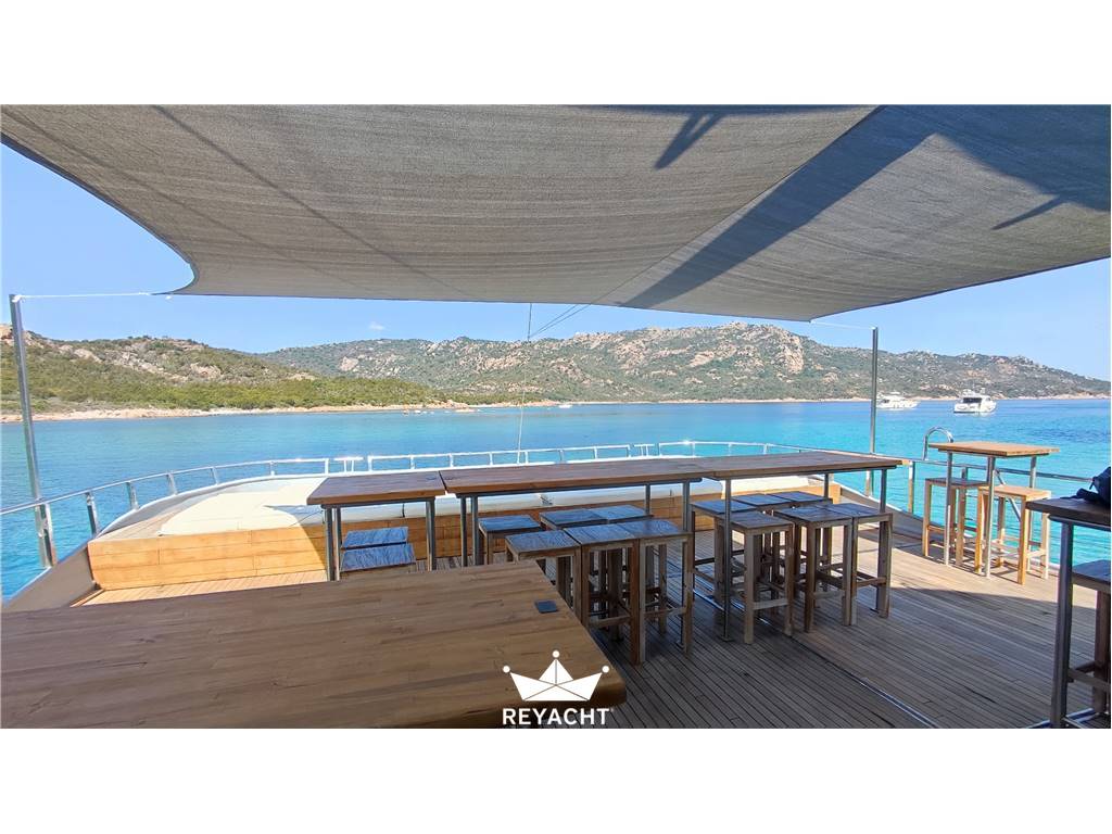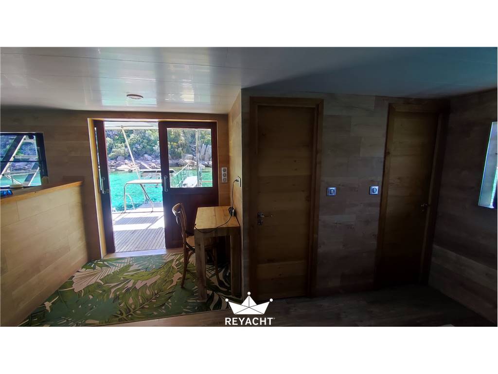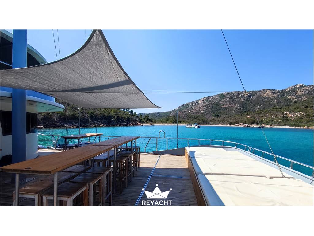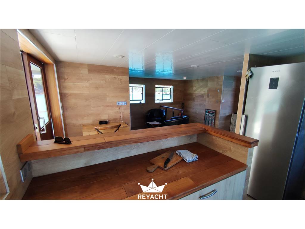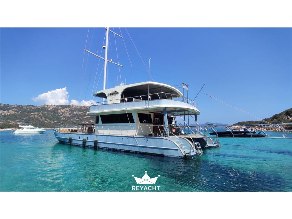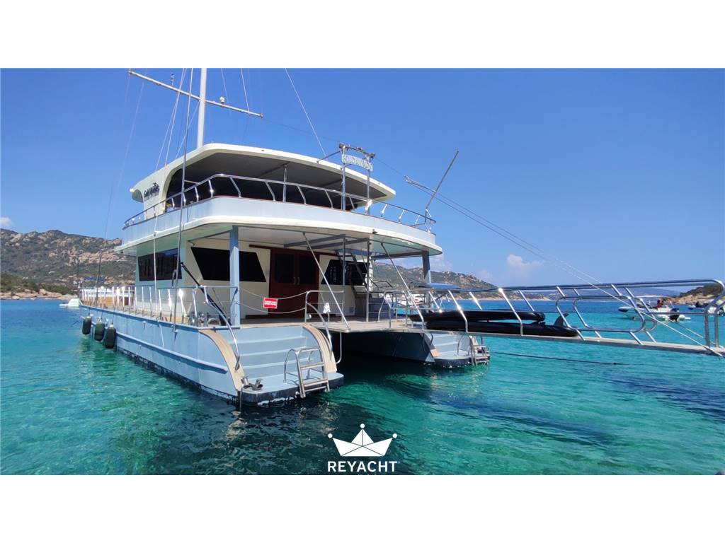 Catamarano in ottime condizioni e allestito con materiali di alta qualità. Pensato per ospitare fino a 25 persone per pranzi, eventi e aperitivi. Dotato di una cucina completa e di un bar che si affaccia sul ponte di prua. Due cabine spaziose e confortevoli con doccia e lavandino. Due toilette indipendenti sul ponte principale. Scafo in acciaio da 18 mt, larghezza 8 mt e pescaggio 1,5 mt. Ponte in teak. Due motori Cummins da 170 CV.