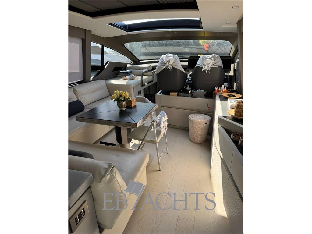 Realizzato con ampio utilizzo di fibra di carbonio, lo scafo garantisce leggerezza strutturale, rigidità e performance elevate, mantenendo al contempo uno stile inconfondibile firmato dal design italiano. Le ampie superfici vetrate e il tetto scorrevole in vetro creano un ambiente luminoso e moderno nel salone principale, in perfetta continuità con gli spazi esterni dedicati al relax e alla convivialità.