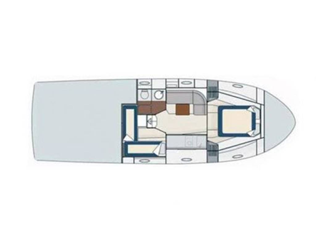 Gli interni presentano una configurazione con 2 cabine matrimoniali e 1 bagno. La cucina è ben attrezzata e il salone è stato modificato rispetto alla versione standard, con la sostituzione del tavolo originale con un divano-letto “siesta” e ulteriori spazi per lo stivaggio.