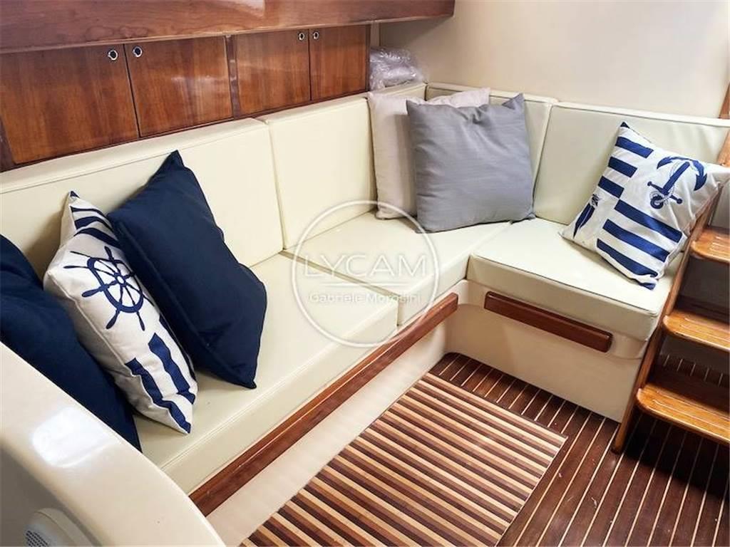 Scendendo sottocoperta dal tambuccio centrale si accede alla dinette con divano L lungo la murata di dritta mentre sul lato opposto vi sono il locale toilette e a seguire il mobile cucina.