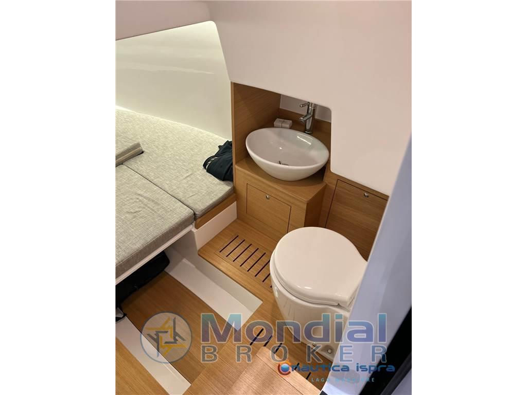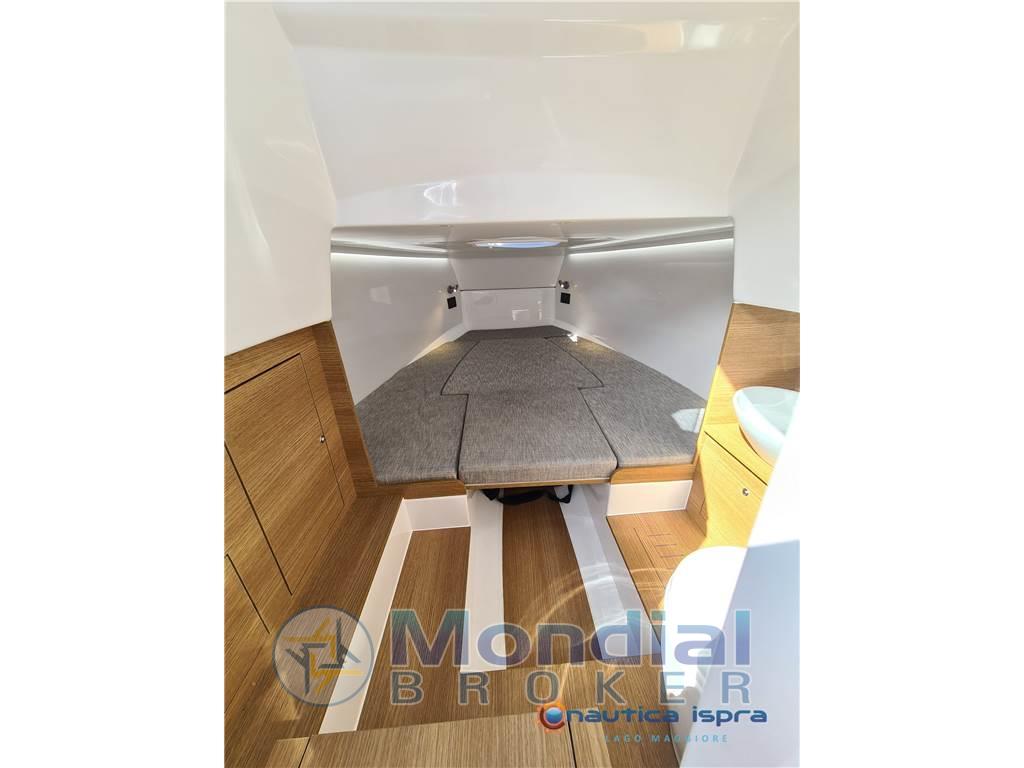 Vi troviamo l'ingresso sottocoperta per l'accesso al bagno e al letto per due persone, la timoneria con seduta di governo "stand-up" che racchiude uno storage ,oppure vari optional come frigo e ice maker. Adiacente alla console sono disposti due divanetti "face to face" con tavolo centrale.