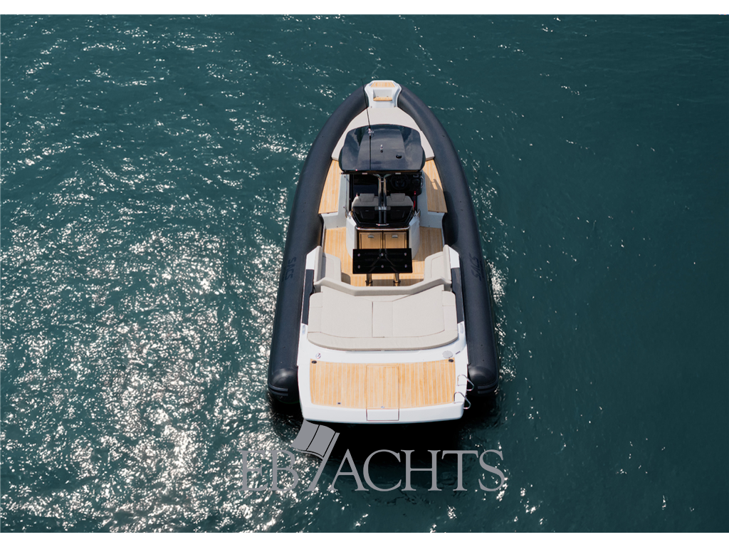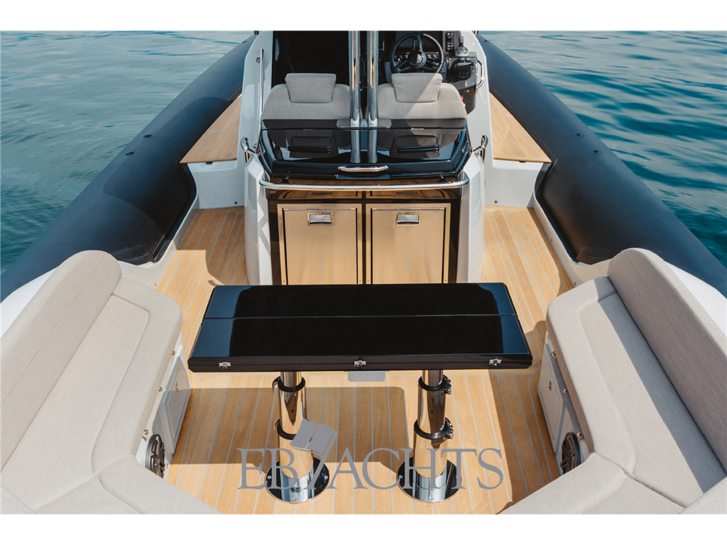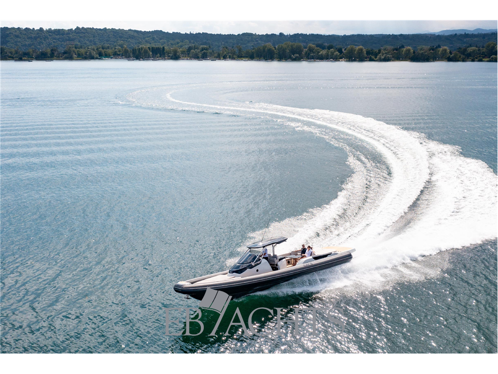 Il gommone offre spazi esterni ampi e ben organizzati, con grande prendisole a prua e a poppa, dinette conviviale nel pozzetto e postazione di guida ergonomica con strumentazione completa. La coperta è pensata per vivere il mare in totale comfort, sia durante le uscite giornaliere sia per crociere brevi con amici e famiglia.