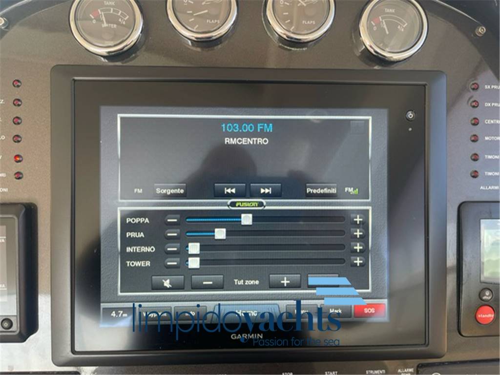 Batterie, Caricabatterie, Elica di poppa - stern thruster, Elica di prua - bow thruster, Flap idraulici, GPS, Luci subacquee, Passerella, Pilota automatico, Pompa di sentina automatica, Pompa di sentina elettrica, Pompa di sentina manuale, Pozzetto Teak, Radar, Radio VHF, Tavolo pozzetto, Tromba