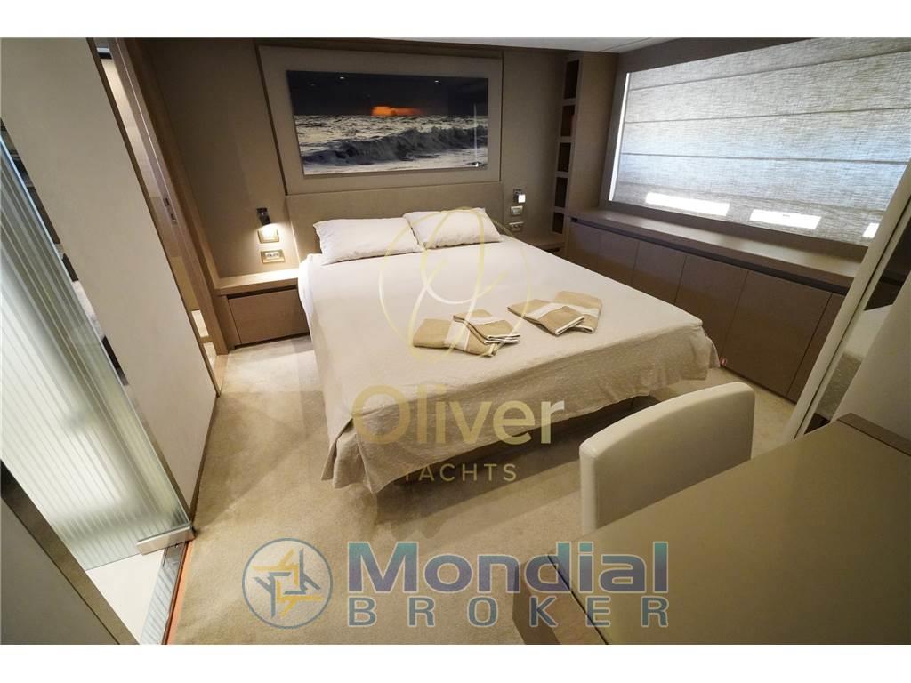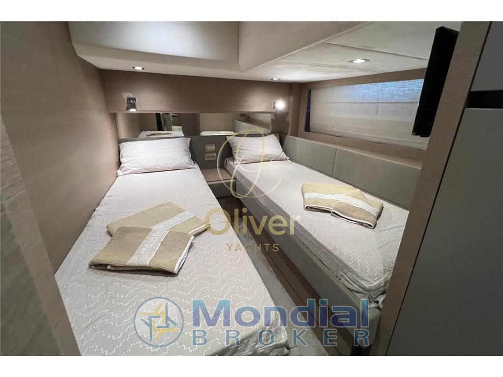 La cabina armatoriale full beam, che si trova a prua sul ponte principale, è il punto di forza: spaziosa, con letto centrale, armadi capienti e bagno privato con doccia separata. La cabina VIP anch'essa full beam a centro barca offre volumi generosi e finiture di livello, mentre le due cabine ospiti con letti singoli completano un layout a quattro cabine ben equilibrato. In totale sono presenti tre bagni dedicati, oltre alla cabina equipaggio separata a poppa.