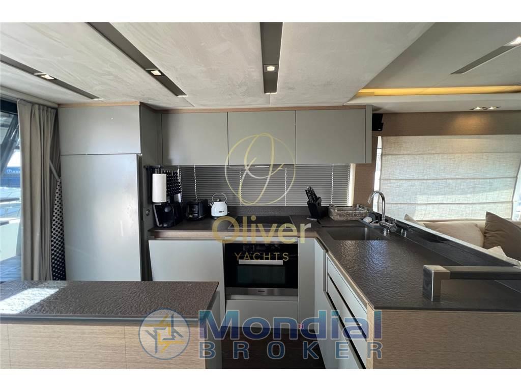 La cucina è completamente attrezzata con freezer, microonde e elettrodomestici moderni, pensata per permanenze prolungate a bordo. Materiali, finiture e falegnameria mantengono uno standard elevato, con uno stile contemporaneo che non mostra segni di invecchiamento.
