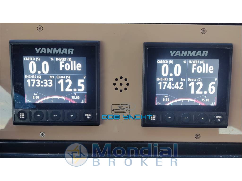 strumenti motore YANMAR digitali con doppio display, manette elettroniche, gps GARMIN interfacciato con ECO, vhf GARMIN, flaps BENNETT con indicatori digitali, pilota automatico, bussola, luci via, tromba, stereo con n* 4 casse, conta catena.