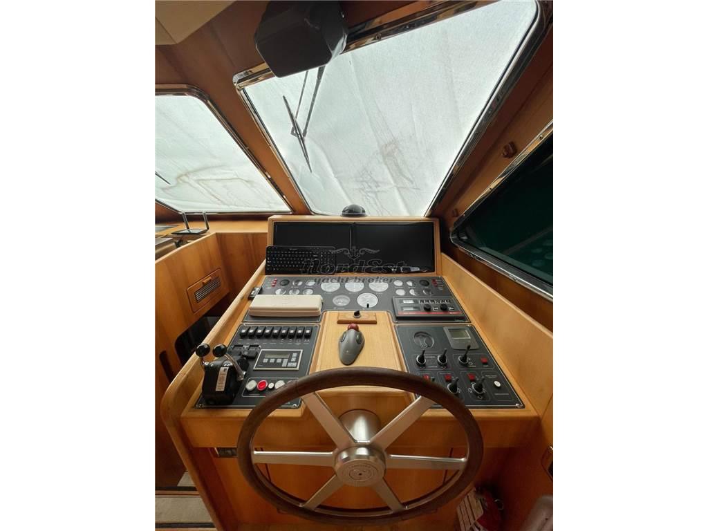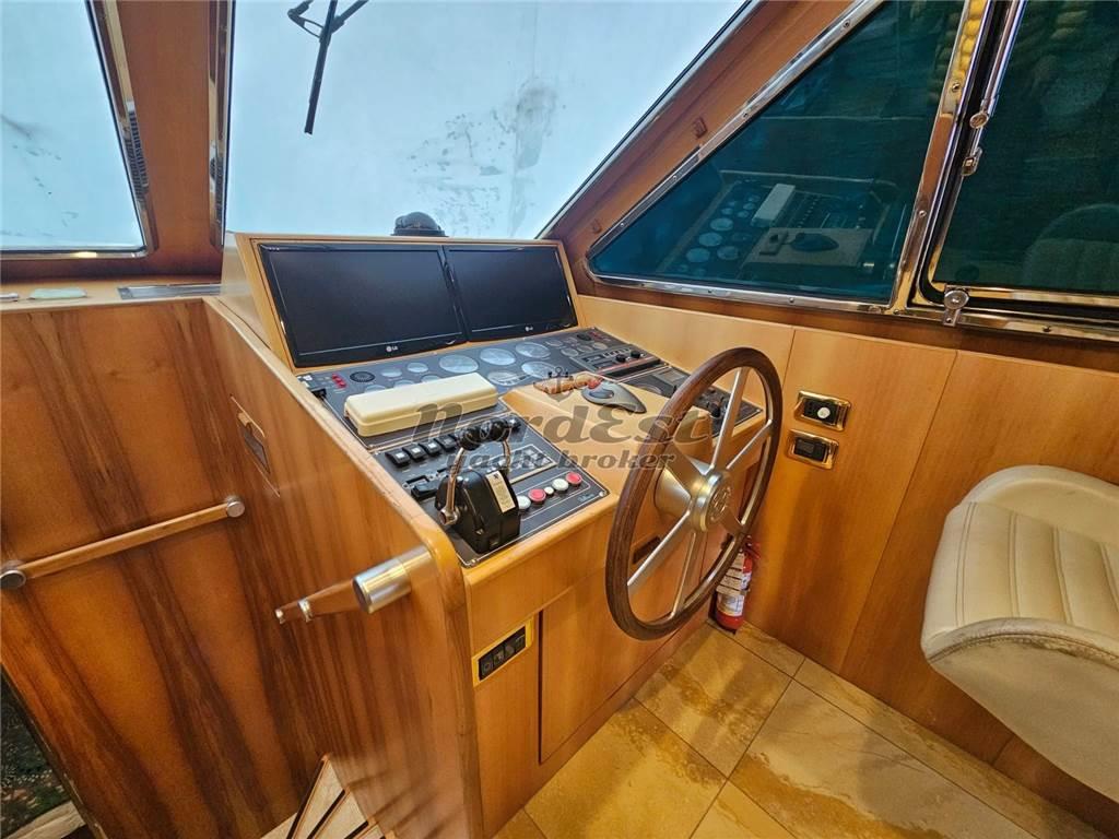 La plancia di comando interna ha un posto guida completo di tutta la strumentazione necessaria: radar, GPS, pilota automatico, contametri per catena, telecomando di manovra per motori e bow thruster di prua e di poppa, VHF.