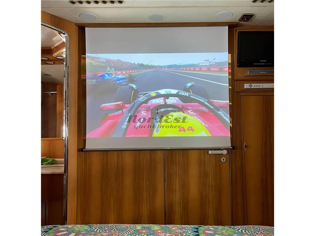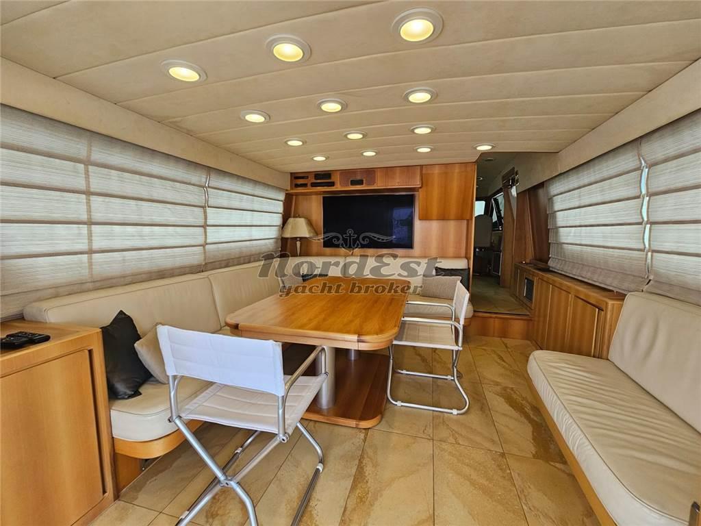 Il salone è completo di 2 divani in pelle, sotto ai quali sono presenti ampi spazi di contenimento; tavolo allungabile fino a 3 metri per 10 persone; TV Samsung 70"; impianto stereo Garmin con filodiffusione nei vari ambienti dell’imbarcazione; frigorifero per bevande; mobili sagomati per stoviglie e bicchieri; tendaggi elettrici; porta di ingresso in acciaio inox elettrica.