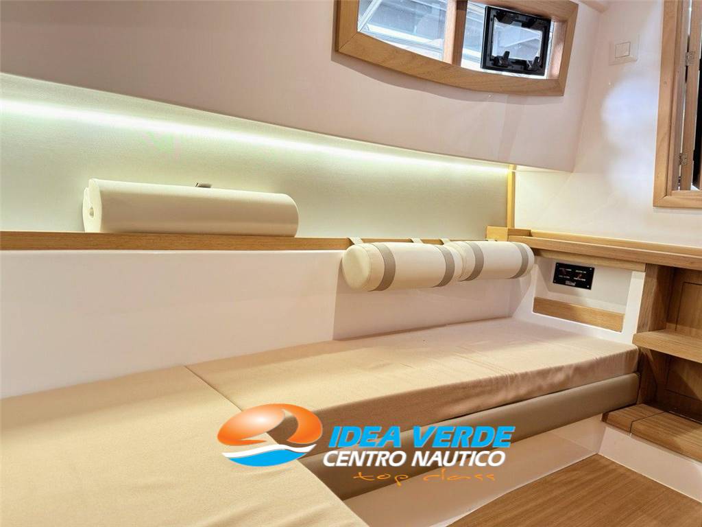 The interior of the Mimì Libeccio 8.50 Cabin is designed to offer a welcoming, refined and functional environment, capable of ensuring comfort even during prolonged stays on board. The cabin is well organized, with a comfortable sleeping area, storage spaces and a layout that prioritizes livability and freedom of movement. The dinette, bright and carefully curated, creates a convivial environment perfect for lunches, moments of relaxation or stops in the roadstead. The finishes, upholstery and quality of the materials immediately convey the feeling of a carefully crafted boat, where each element is designed to combine aesthetics and practicality. An elegant, maritime and welcoming interior, ideal for experiencing the sea in style.