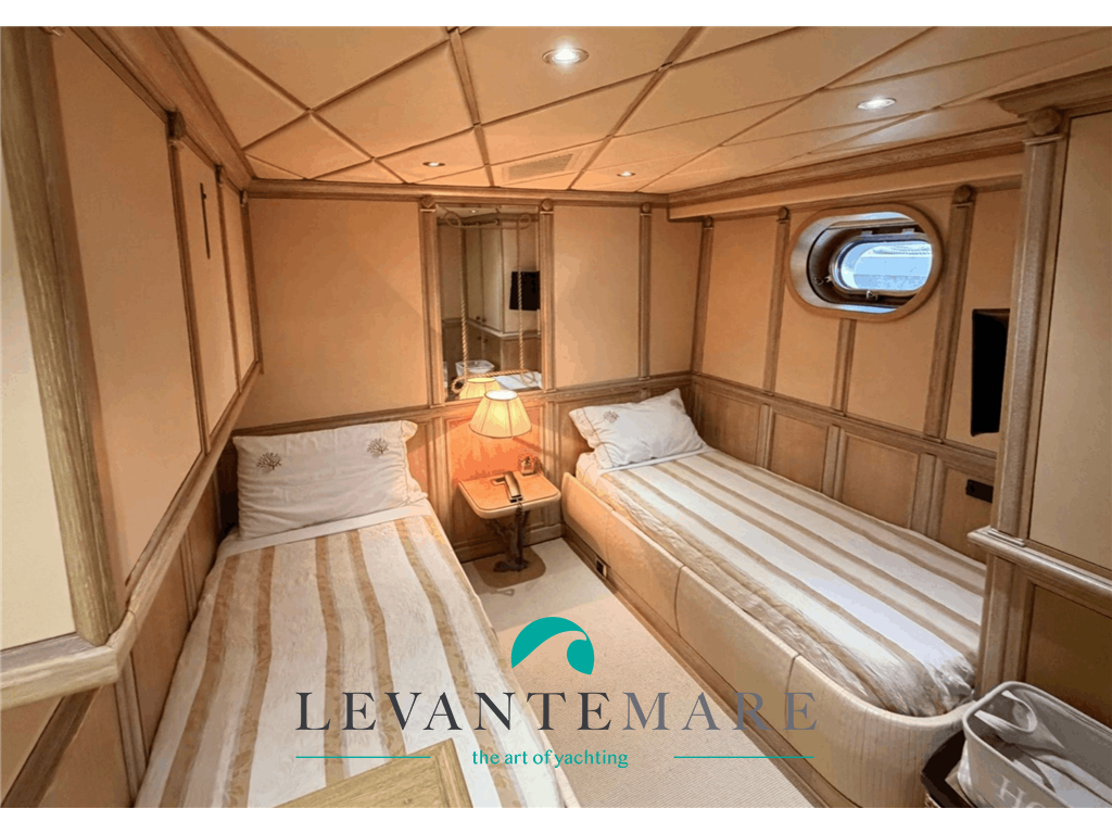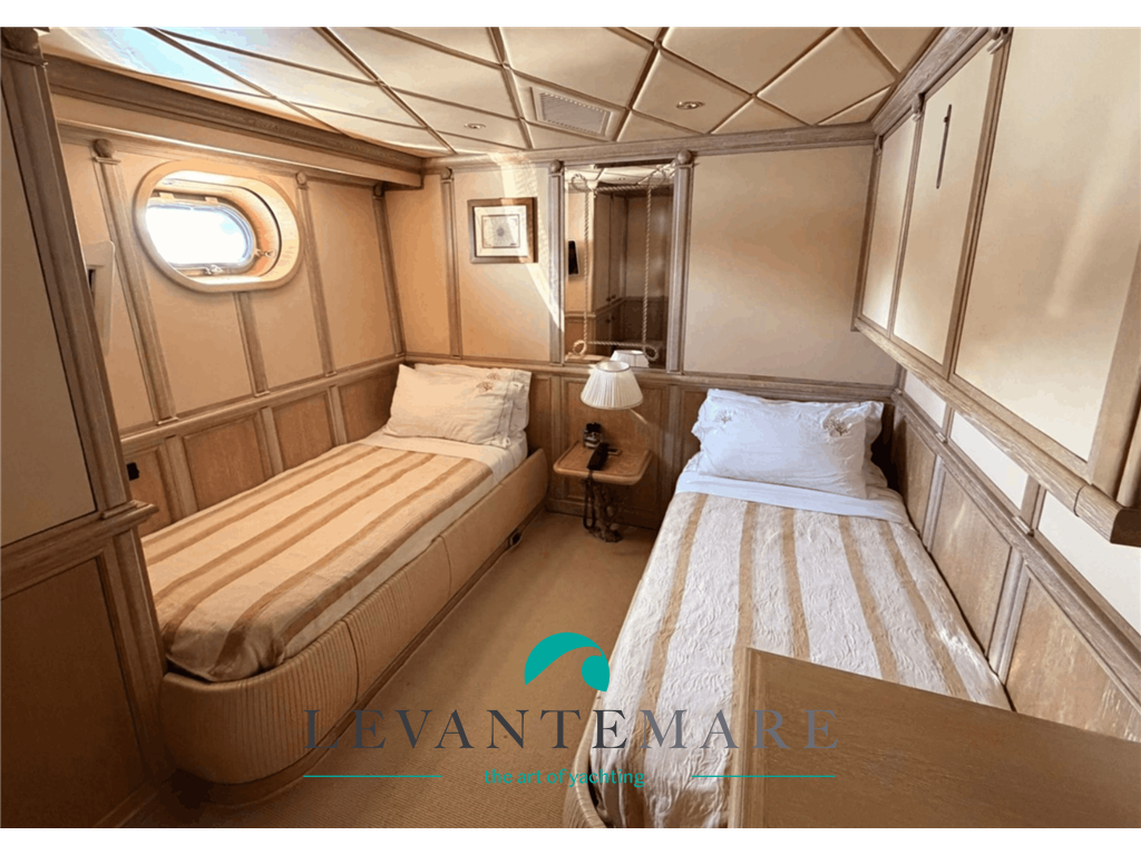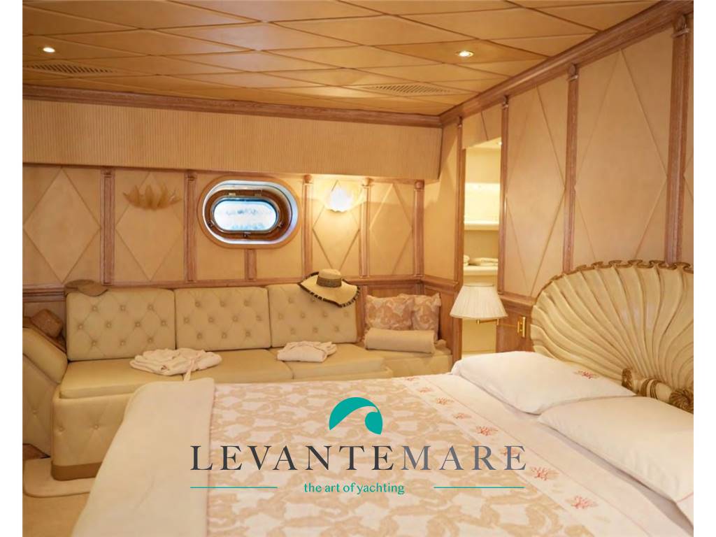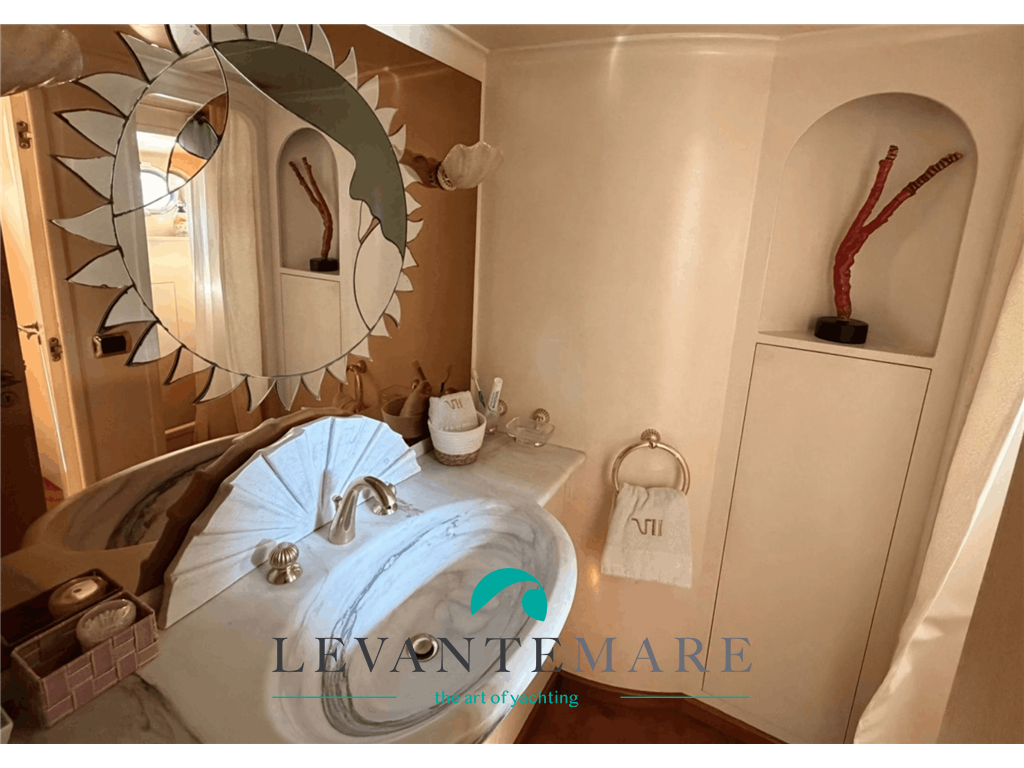 La CABINA ARMATORIALE ha in ingresso un armadio contenitori ed una cabina armadio, un letto king size ed una poltrona Frau che può essere utilizzato come letto e dispone di bagno ensuite “imperiale” nel verso senso della parola: quest’ultimo è costituito da mosaico artistico a tema marino, il lavello a forma di preziosa conchiglia è ricavato da un massiccio pezzo di Marmo di Carrara e dispone di tutti i servizi e le comodità. Le CABINE OSPITI sono due, ciascuna con 3 letti ed il proprio bagno del tutto accessoriato ed impreziosito anche qui da pregiati materiali.