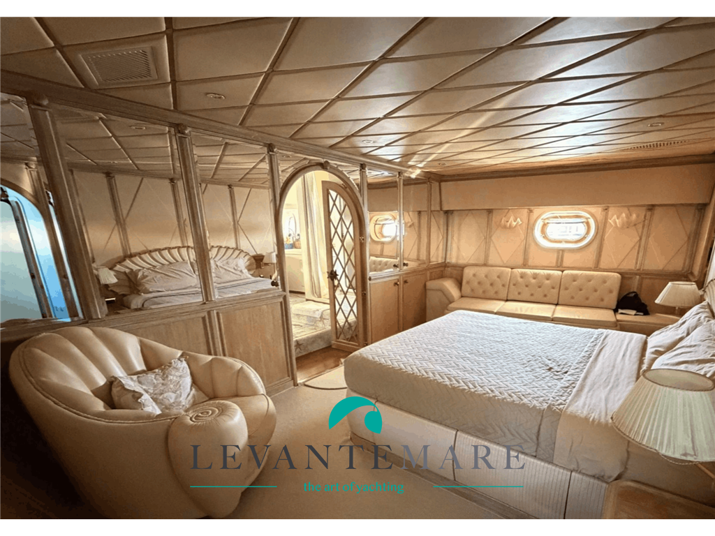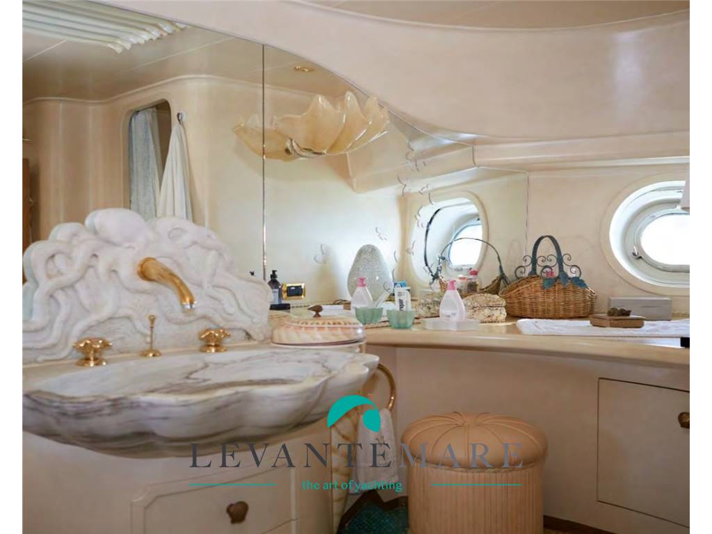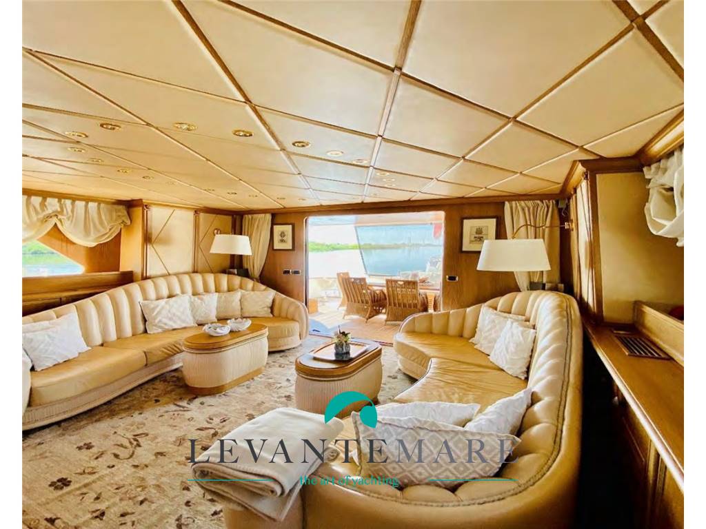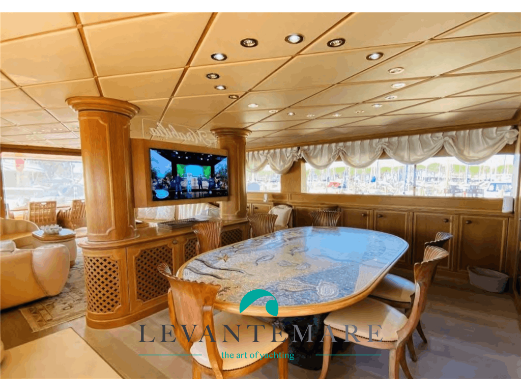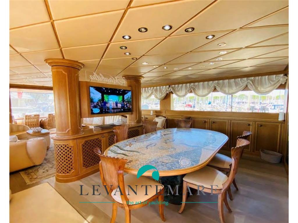 PONTE PRINCIPALE: A poppa salotto/soggiorno con grande tavolo per ospitare fino a 8 persone, con preziose sedie in corda intrecciata e divano e cuscineria. Entrando ci si trova in un grande salone con tv, impreziosito da dettagli unici e particolari: due grandi divani rivestiti Frau con tavolini in quercia rivestiti in pelle Bentley plissettata, il tutto affiancato dalla struttura tv in ebano e colonne di marmo, con ripiano girevole per SmartTv Sony Oled. Tappeto persiano e controsoffitto isolante ricoperto da preziosa “fior di pelle”, tutti i legni e decori sculturati sono in quercia sbiancata, in perfette condizioni e mantenimento. Luci a ledi, tutte le tende a comando elettrico, porte scorrevoli ed automatiche. Ad impreziosire ancora di più la zona soggiorno è il tavolo con mosaico artistico sostenuto dalla scultura in bronzo marino, con sedie a conchiglia sculturate nella quercia, sovrastato da uno specchio che permette la visione della tv a tutti i commensali. Presente un bagno giorno particolarissimo, in stile marino con lavello sculturato in pietra e preziosi decori unici come maniglie e rubinetteria. Accesso con scalinata alla zona Fly.