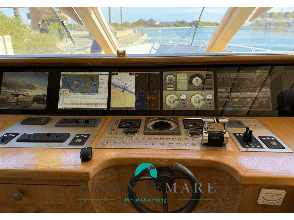 Monitor, Chart Plotter, Autopilota Navicontrol AP3003, Radar Furuno NavNet, Ecoscandaglio B&G, VHF Sailor, Navtex Furuno NX-500, Bussola, Videocamera notturna, AIS, Timone, Tromba, TV satellitare, Telefono satellitare, Batterie di servizio, Batterie motori, Batterie generatori, Alimentazione a terra, Inverter, Caricabatterie Mastervolt, Aria condizionata Condaria 55000 BTU, Terza stazione di manovra, Elica di prua idraulica, Elica di poppa idraulica, Ventilazione macchine, Indicatore dei flaps, Luci subacquee, Linea d'asse, Pompa di sentina elettrica e manuale, Dissalatore Idromar, Passerella idraulica Pincraft, Scaletta bagno, Scaletta laterale, Tonneggio a poppa, Verricello Lofrans, Ancora CQR, Catena, Gru idraulica, Piattaforma, Zattere, Sistema antincendio, Sistema d'allarme, EPIRB, Invertitori, Eliche Nibral, Spiaggetta di poppa idraulicamente sommergibile, Sistema monitoraggio barca