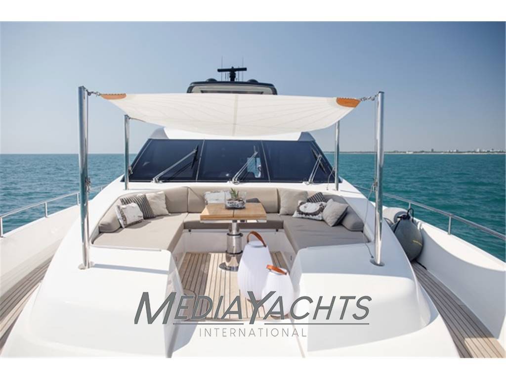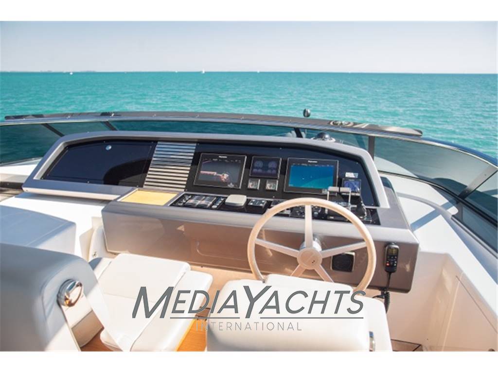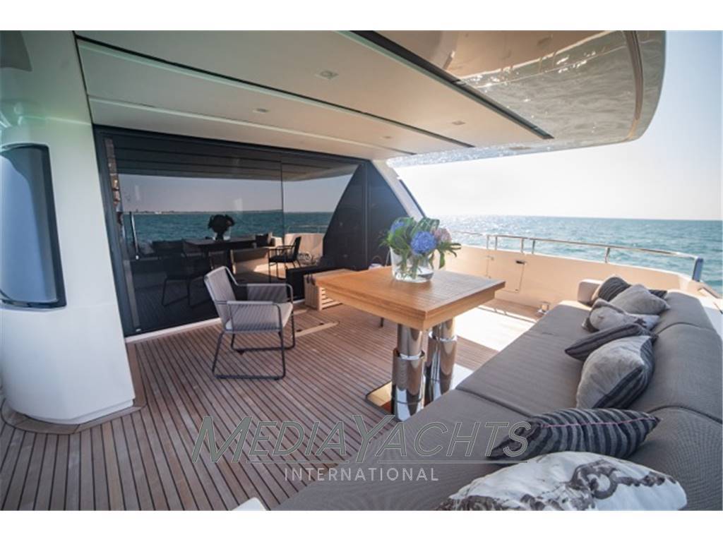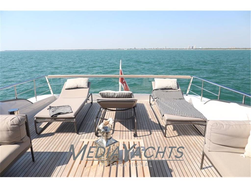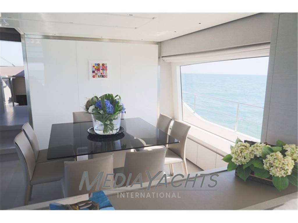 Battery charger for generators CCTV with 1 fixed camera in the cockpit + 2 fixed in SM Additional touch screen in the captain's cabin 4G internet modem - wi-fi with hotspot antenna for port network Search lighthouse with wheelhouse and fly control Additional soundproofing between SM bulkhead and owner's bathroom Additional soundproofing stabilizer fin boxes Dimmer package for outdoor use Indoor dimmer package Watertight 220V socket in fly bar cabinet Salt water pump with garage connection - Raymarine DIAMOND package 4 diving lights (2 aft + 2 side) Additional wheelhouse glass covers in black tri-layer fabric N.2 chain counter (n.1 on flybridge + n.1 in wheelhouse ONLY on DN anchor) Upgrade to second 25kW generator (25kW main generator) Hydraulic stern thruster Zero Speed Electric Stabilizer Fins Hard top with electrically operated louvered roof Teak deck on the fly FLIR infrared camera with thermal viewer + low light SEATEL ST24E SAT TV antenna Empty radome SAT antenna for symmetry on Hard Top Fixed MTU control station in cockpit Fly aft area awning Watermaker 180 Lt / h Glendinning CM7 electric shore cable DIAMOND Audio Video Package (NO TV on the fly) 2-burner induction hob on flybridge bar cabinet Wine cooler in salon Icemaker in the mobile bar on the fly Teak in the dinette on the foredeck Additional mobile storage to the left of the fly in Corian and doors in slatted teak Bar furniture DN of the fly in Corian and doors in slatted teak (diff. From std) Stainless steel shower column on the fly Anchor chain 150 meters long Positioning of the air conditioning control at the entrance to the hall Transparent protection on the electrical cables in the engine room Steel collar on bow stanchions for life-line protection. Lateral handrail and stern gates with child protection