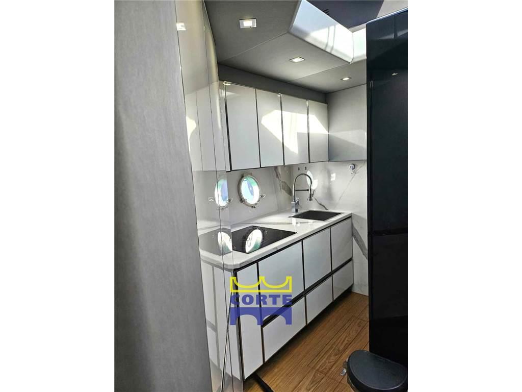 Sottocoperta: cucina a dritta, con frigorifero, lavastoviglie, winecooler e piastre.