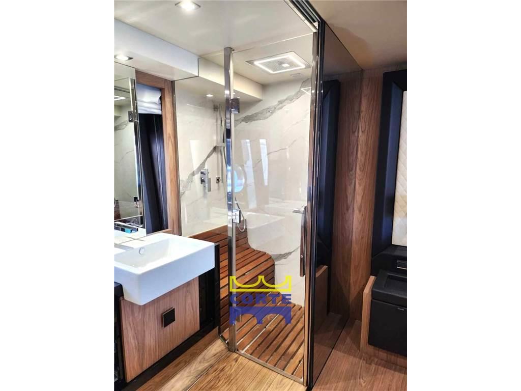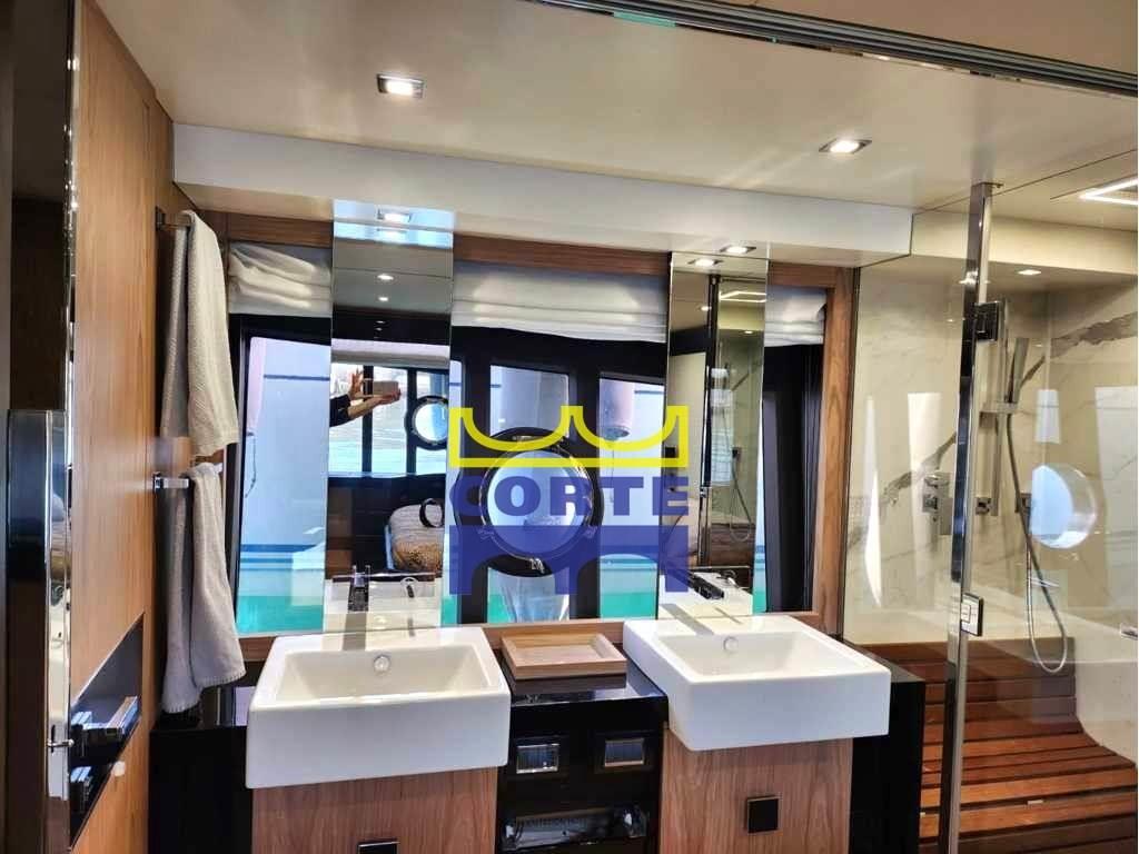 Allarme fumo/gas, Allarme motore, Allarme sentina, Ancora, Autoclave, 12 Batterie (AGM Mastervolt), Bussola, Camminamenti laterali in teak, Caricabatterie, Comando motori elettronico, Computer di bordo, Contametri catena, Contamiglia, Display, Doccia esterna, Ecoscandaglio (Raymarine), 3 GPS (Raymarine touch screen), Impianto antincendio, Log, Passerella (idraulica), Pilota automatico, Pompa di sentina automatica, Ponte in teak, Porta ingresso, Pozzetto Teak, Presa 220V banchina, Presa acqua banchina, Radar (Open Array 4 Kw), Radio VHF, Salpa Ancore Elettrico, Scaletta da bagno, Tavolo pozzetto, Tromba