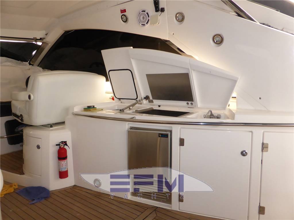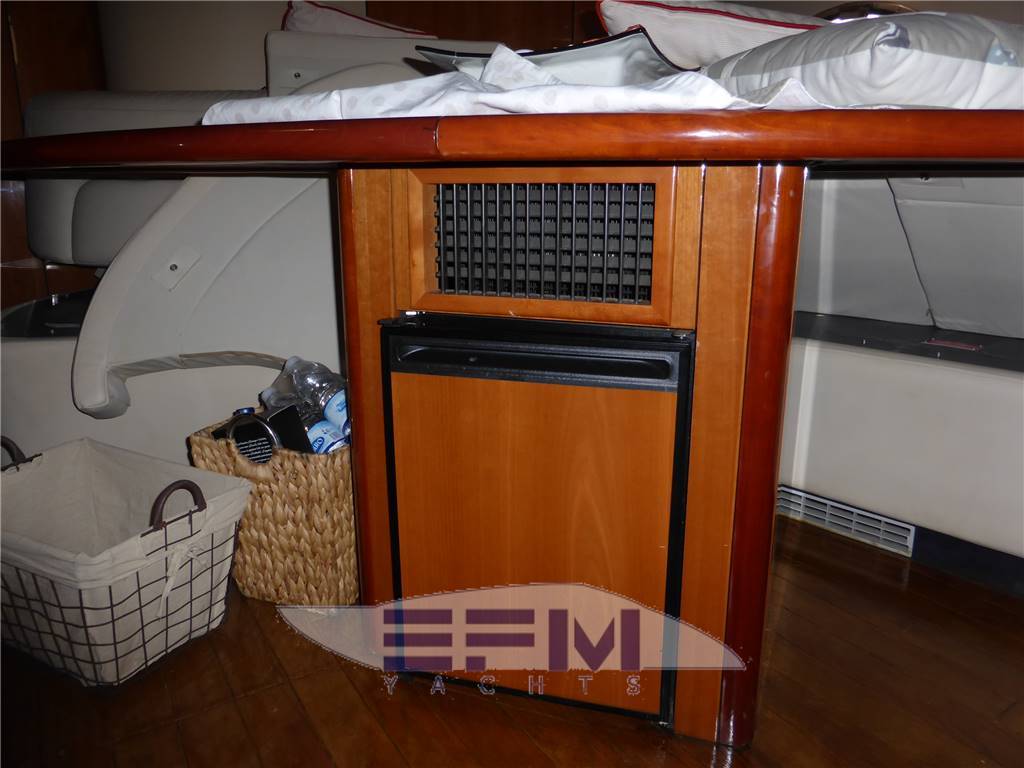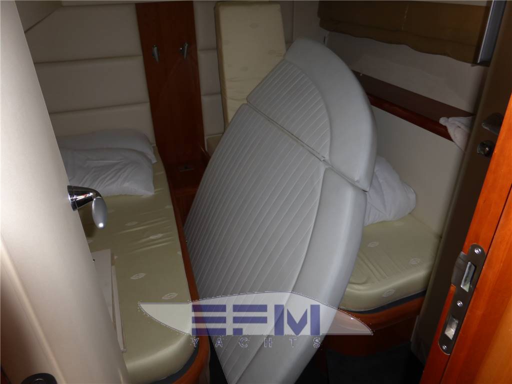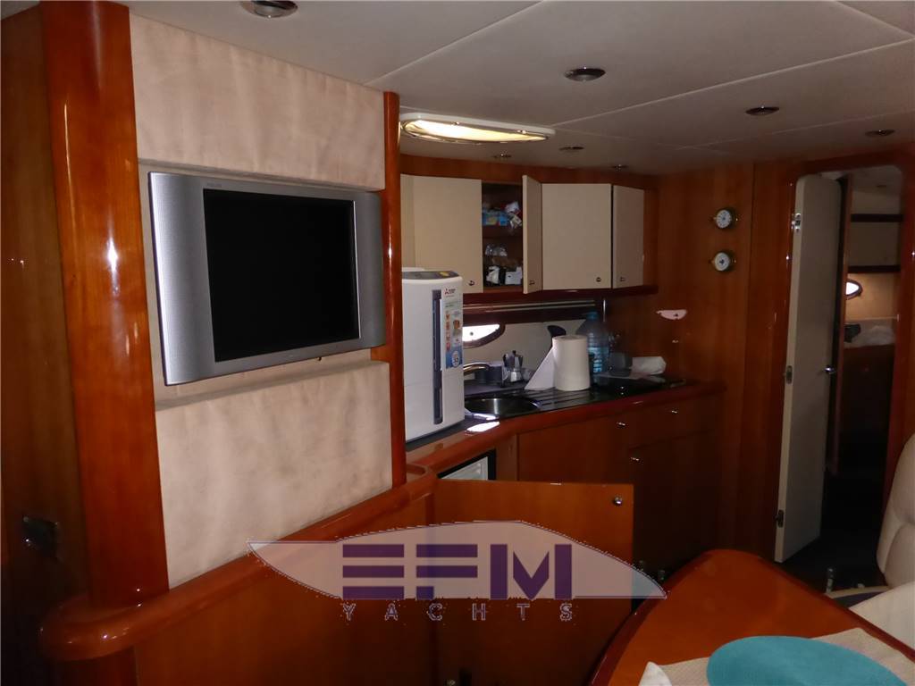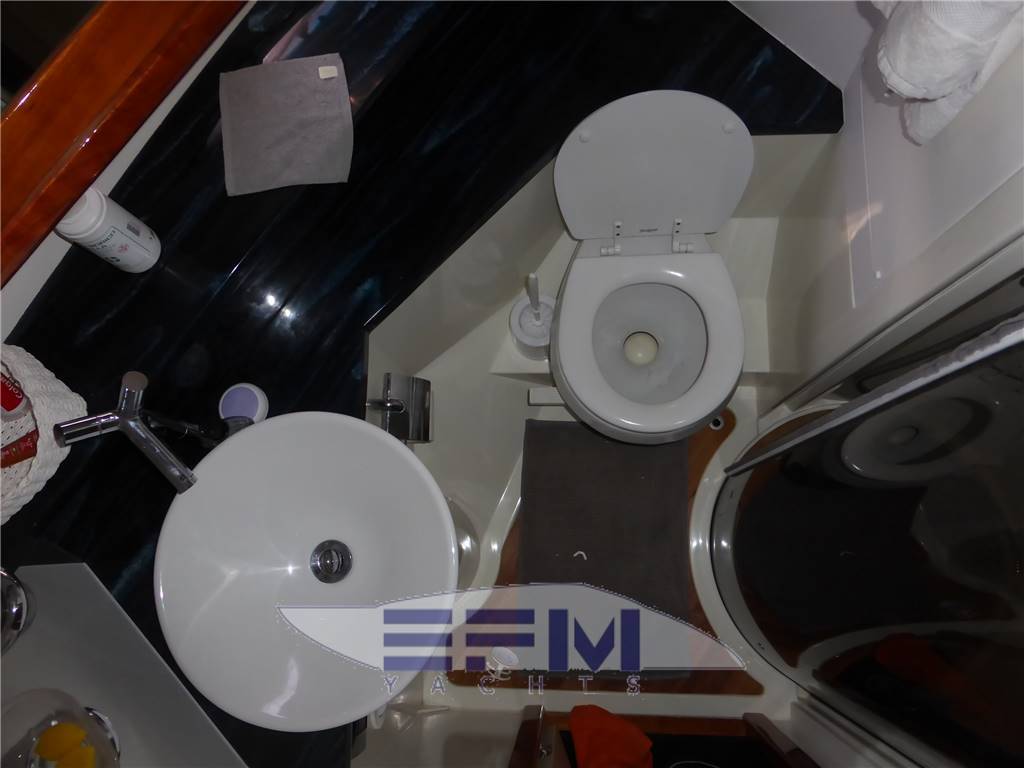Classic high gloss cherry interior and carpeted floors - the lower deck on the starboard side the square consists of a large living room with sofa-shaped S in cream-colored leather and teak table crescent-shaped puff with 2 removable - In front of the sofa furniture to side with the LCD TV on the wall and plant Ski with DVD and stereo radio with CD player, which continues connected with the great walled kitchen complete with 4 burners + vCR + Panasonic microwave refrigerator, cabinets, pantry and cabinets for Kambusa. Entrance from the living room is on the left aft guest cabin with two twin beds and wardrobe furniture, LCD TV on the wall, and a private entrance to the large bathroom with electric toilet and separate shower cabinet and with external entrance also from the dinette. On the right hand there is the second guest cabin with two beds at The French and cupboards and drawers - the spacious forward cabin with large double bed with Sharp LCD TV on the wall and a private bathroom with electric toilet and shower cabinet separate - in the cockpit there is a large C-shaped sofa with teak table and retractable opposed the mobile kitchen complete with sink, cockpit fridge, electric stove and icemaker. Above all 'hangar for the tender are a large sundeck in the cockpit and on the ground' s access to the engine room