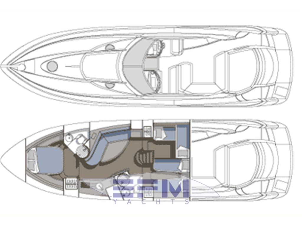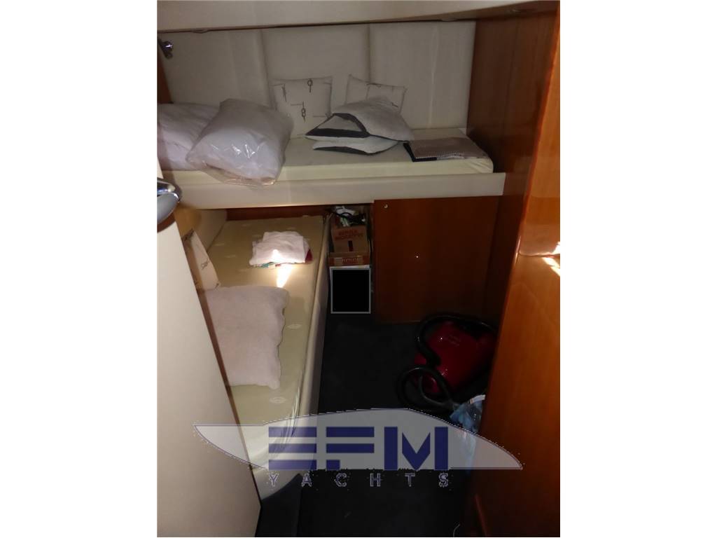 Classici interni in ciliegio lucido e pavimento in moquette - Al ponte inferiore a dritta il quadrato composto da una ampio salone con grande divano sagomato a S in pelle color panna e tavolo in teak a forma di mezzaluna con 2 puff amovibili - Davanti al divano un mobile a murata con il tv lcd a parete e impianto Ski con dvd e radio stereo con cd , che prosegue raccordato con la grande cucina a murata completa con 4 fuochi in vcr + forno micronde Panasonic + frigo , pensili , dispensa e mobiletti per kambusa. Con entrata dal salone troviamo verso poppa a sx la cabina ospiti con 2 letti in piano mobile e armadio ,tv lcd a parete , e entrata privata al grande bagno completo con wc elettrico lavabo mobiletto e box doccia separato e con entrata anche esterna dalla dinette. A dx invece troviamo la seconda cabina ospiti con 2 letti ad L alla Francese e con armadi e cassettiere - a prua la spaziosa cabina Armatoriale con grande letto matrimoniale con tv lcd Sharp a parete e con bagno privato completo con wc elettrico lavabo mobiletto e box doccia separato - nel pozzetto troviamo il grande divano a C con tavolo in teak a scomparsa e contrapposto il mobile cucina completo con lavabo, frigo a pozzetto, piastra elettrica e icemaker . Sopra all' hangar per il tender troviamo il grande prendisole e a terra nel pozzetto l' accesso alla sala macchine -