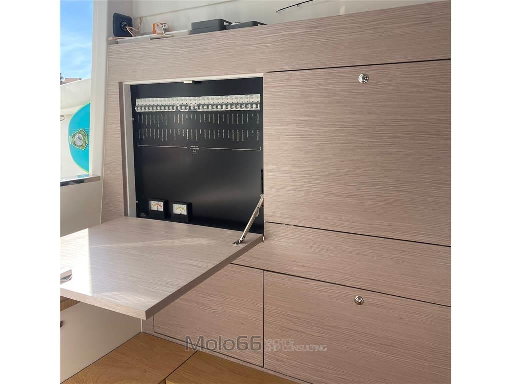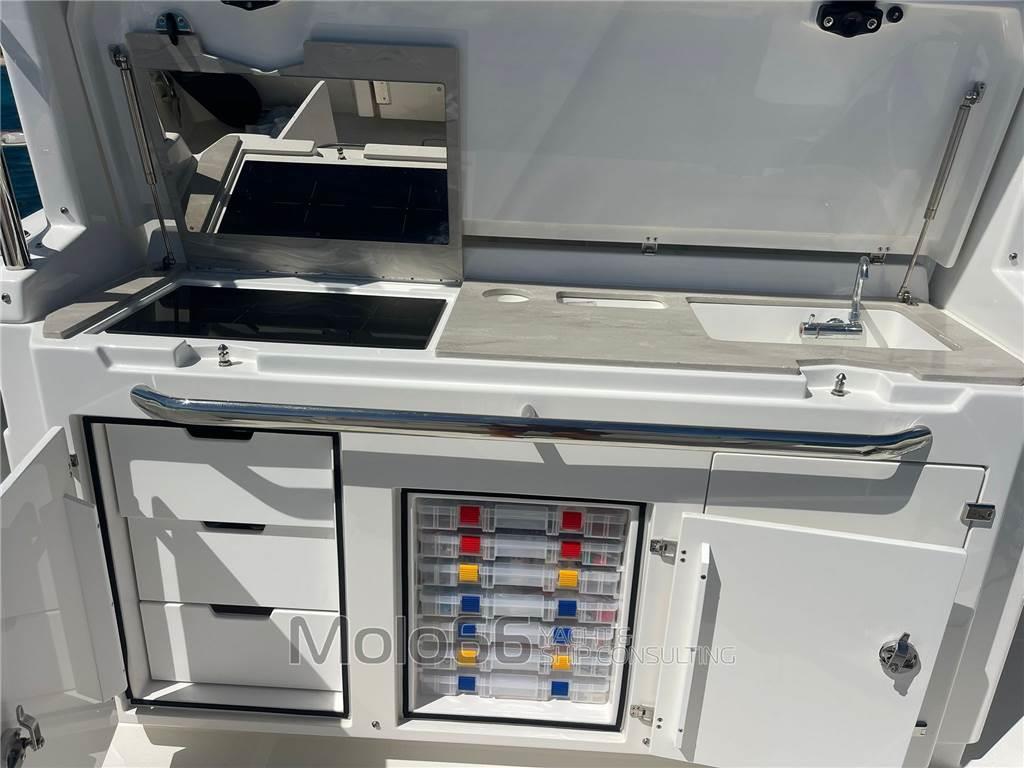 Allarme motore, Allarme sentina, Ancora, Autoclave, Batterie, Bussola, Caricabatterie, Comando motori elettronico, 2 Display (Garmin), Doccia esterna, DSC vhf, Ecoscandaglio, Elica di prua - bow thruster, Faro orientabile, Flap elettrici, GPS, Hard top, Lavandino nel Pozzetto, Luci di cortesia, Luci di navigazione, Monitor dei consumi, Parabordi, Pilota automatico, Plotter con antenna GPS, Pompa di sentina automatica, Pompa per Acqua di Mare, Porta ingresso, Porta laterale, Presa 220V banchina, Radio VHF, Salpa Ancore Elettrico, Scaletta da bagno, Sedile Copilota, Tromba