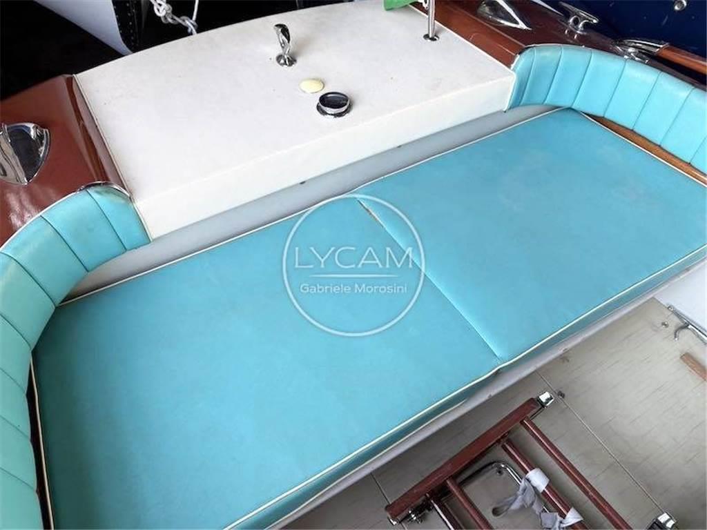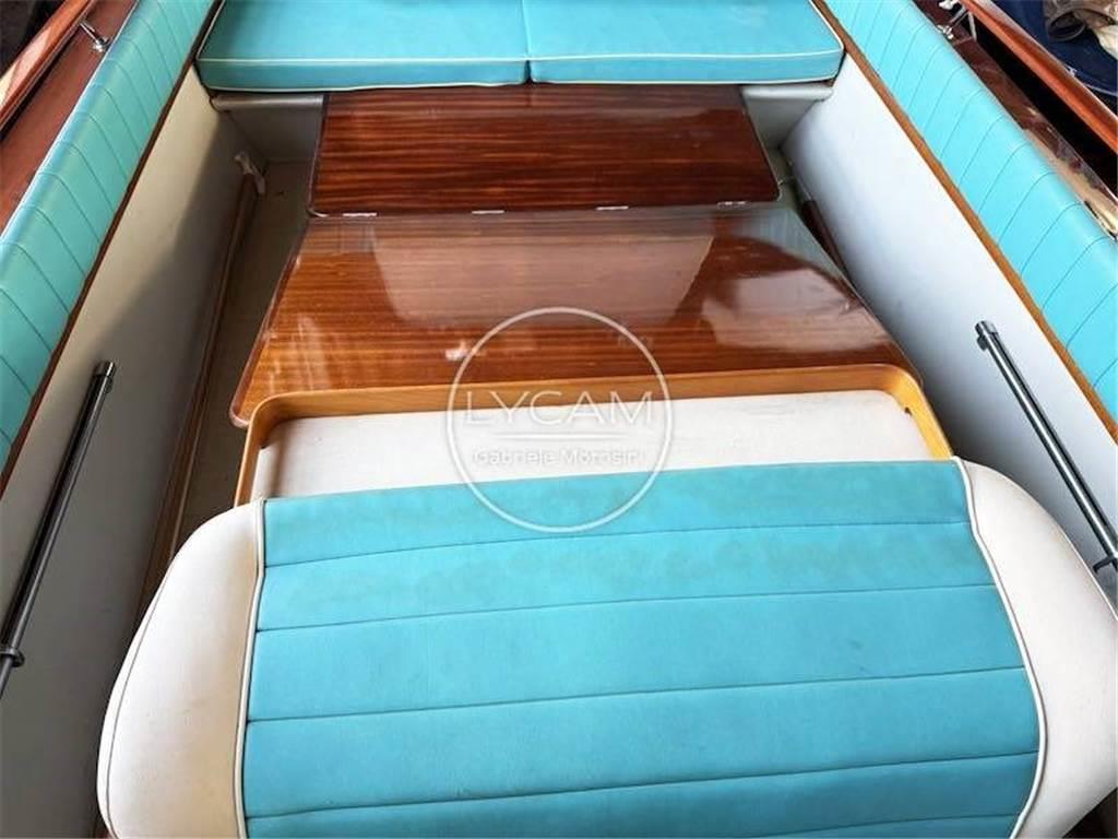 Il layout della coperta prevede un unico grande pozzetto comodamente percorribile in piedi protetti dalle murate e dai raffinati tientibene in mogano fissati su supporti e terminali in bronzo cromato. Il cofano del motore è nella zona centrale del pozzetto e funge da basamento per l’alloggio di un materassino che si collega alle sedute poppiere divenendo così un’unica ampia area prendisole. A proravia del vano motore, oltre un pratico ripiano porta oggetti in legno sono collocate le sedute di pilota e copilota che servono la caratteristica timoneria di derivazione automobilistica protetta da un avvolgente parabrezza su profilo cromato. Eleganti e distintivi del Cantiere, sono gli abbinamenti cromatici delle tappezzerie in vipla incentrate sulle tonalità panna del cruscotto e turchese delle sedute, degli schienali, del burlone e del materassino prendisole