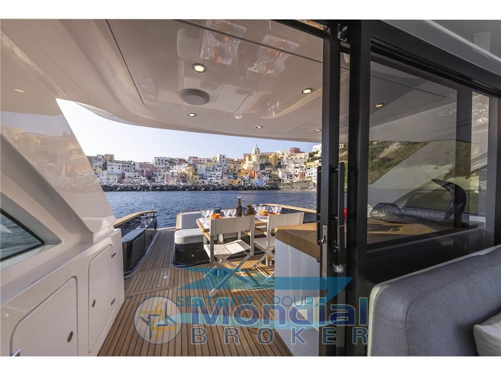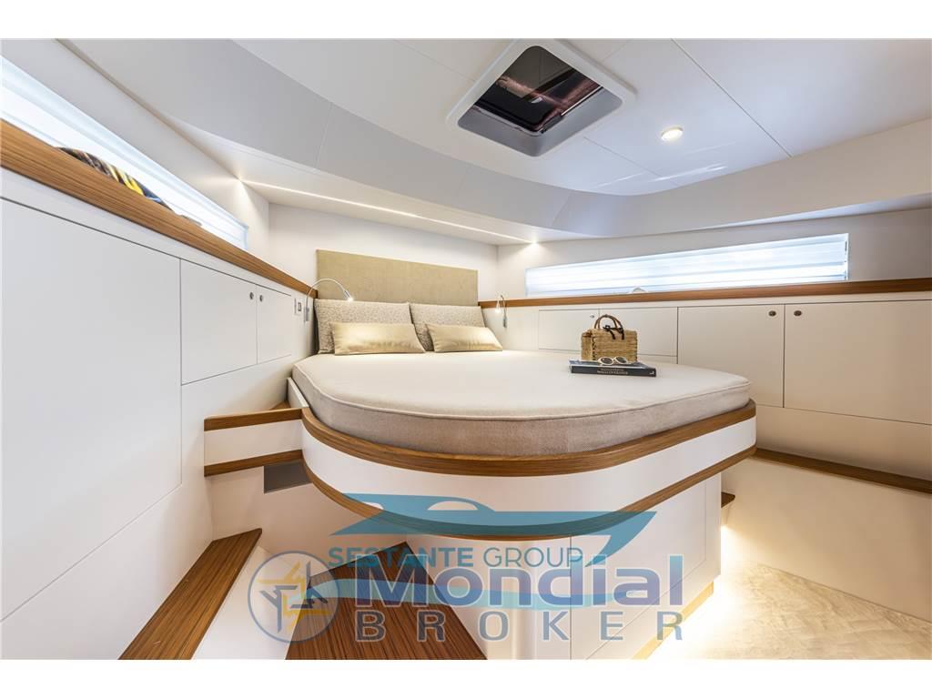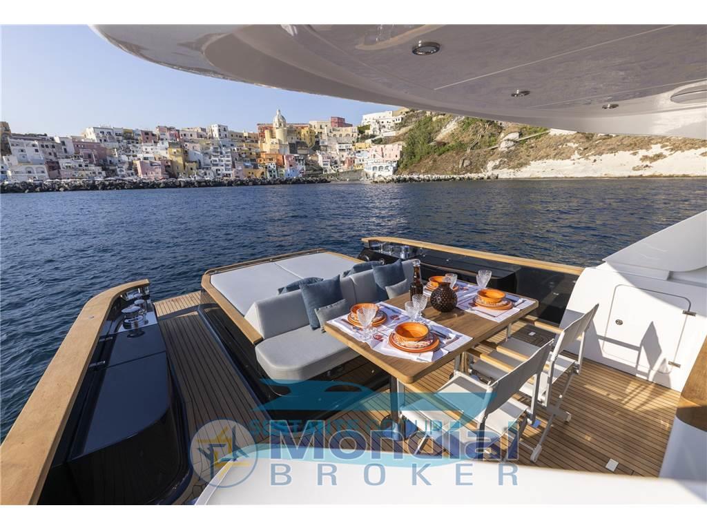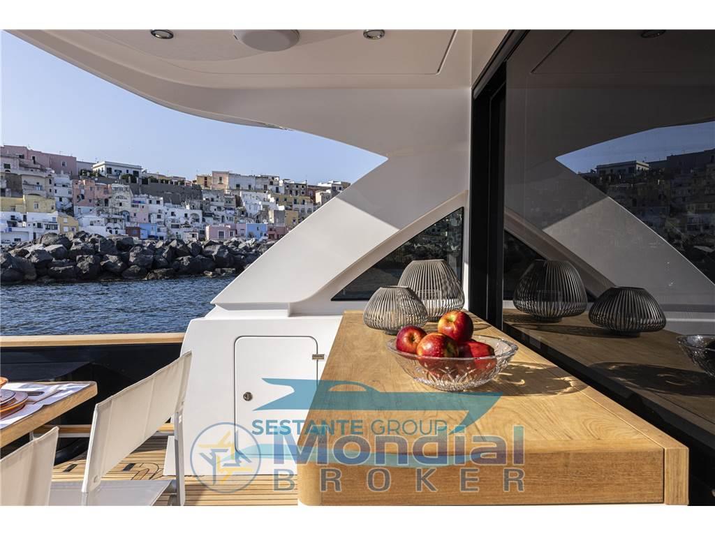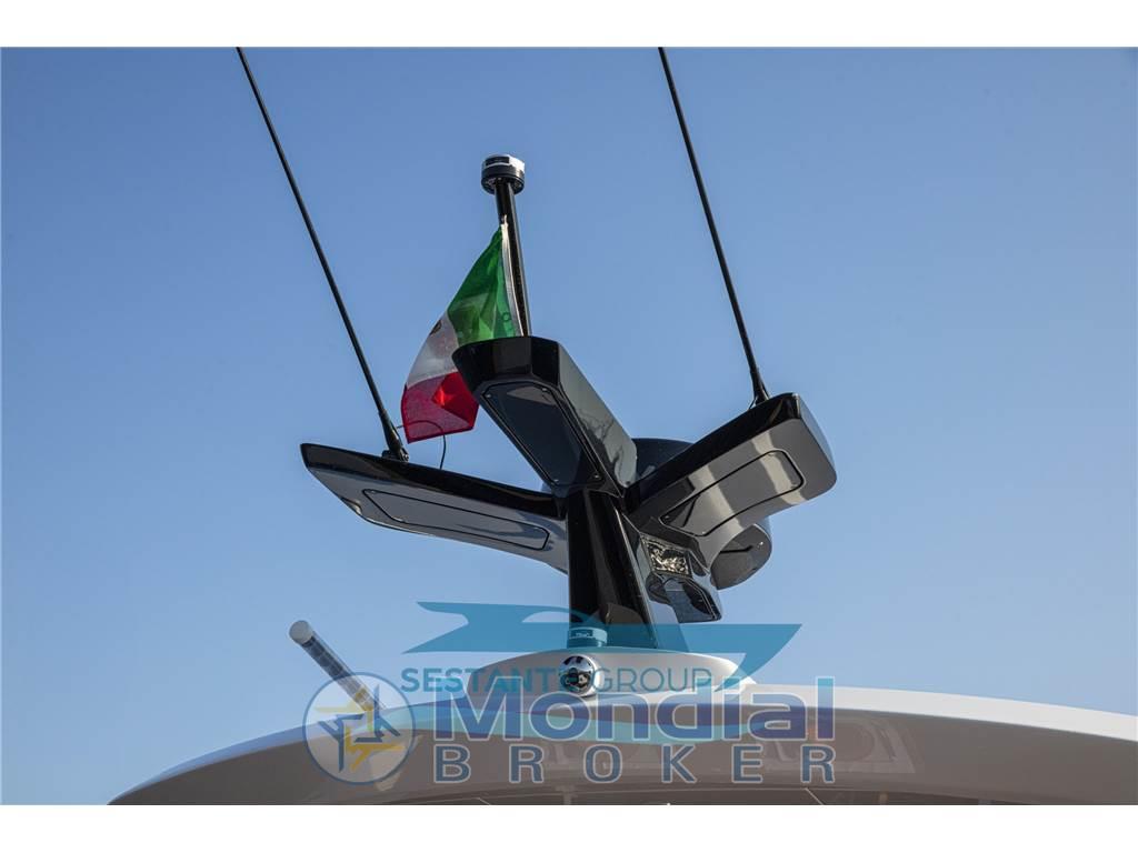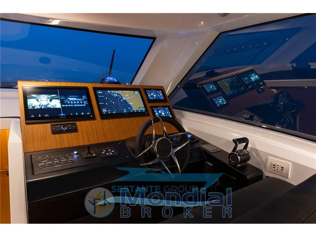 Allarme fumo/gas, Allarme motore, Allarme sentina, Ancora (Trefoil 30 Kg-catena 100mt), Angolo barra, Antenna radar (Garmin), Auto Dynamic Trim Interceptor, 2 Autoclave (GIANNESCHI con controllo elettronico), 2 Autogonfiabile (6 persone), 7 Batterie (4 (225ah) servizi-2 (225ah) motori-1 (90ah) generatore), 4 Bitte Abbattibili, Bocche di Lupa, Bussola, 2 Camminamenti laterali in teak, 3 Caricabatterie, Cavo corrente di banchina, Colorazione speciale, 2 Comando motori elettronico (Marex OS III), 2 Computer di bordo (7" per controllo motori e invertitori), Contametri catena, Contamiglia, 2 Display (16"GARMIN GPSMAP 8416), 2 Doccia esterna (Prua e poppa con miscelatore), Ecoscandaglio, Elica di prua - bow thruster (220 kgf), Garage per tender (con movimentazione elettrica per tender da 2,85mt), GPS, Impianto antincendio, Lavaggio catena, Lavandino nel Pozzetto, Log, Luci di cortesia (led), Luci di navigazione, 3 Luci subacquee (led in acciaio inox AISI 316 L), Monitor dei consumi, Passerella (elettroidraulica a scomparsa), Piattaforma (tenderlift a movimentazione elettroidraulica), Pilota automatico, 2 Plotter con antenna GPS (Garmin multifunzione 16"), 6 Pompa di sentina automatica, 6 Pompa di sentina manuale, Ponte in teak, Porta ingresso (con verniciatura a polvere nera), Pozzetto Teak, Presa 220V banchina (63 A), Radar (GARMIN Radome 24x GMR Fantom), Radio VHF, Salpa Ancore Elettrico (1700 W), Scaletta da bagno, Sedile Copilota, Stabilizzatori (SMARTGYRO SG20), Tavolo pozzetto (in teak con pistone acciaio doppia posizione), Tavolo Salone Abbattibile (in teak con pistone acciaio doppia posizione), Tromba, 2 Winch tonneggio di poppa (700 W), Winch tonneggio di prua